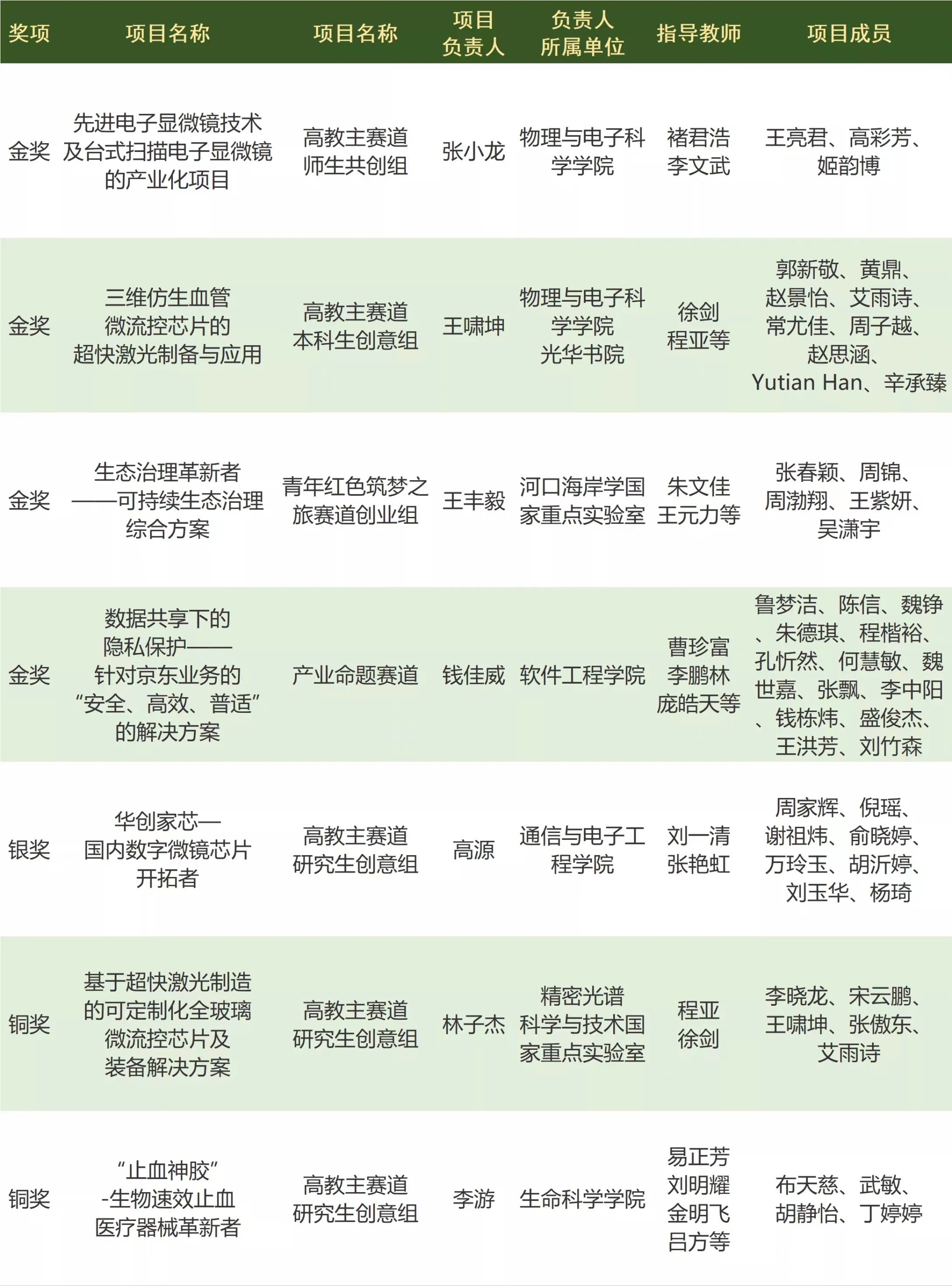 “先进电子显微镜技术及台式扫描电子显微镜的产业化项目”、“三维仿生血管微流控芯片的超快激光制备与应用”、“生态治理革新者——可持续生态治理综合方案”、“数据共享下的隐私保护——针对京东业务的“安全、高效、普适”的解决方案”等4个项目获全国金奖。“华创家芯—国内数字微镜芯片开拓者”获全国银奖。“基于超快激光制造的可定制化全玻璃微流控芯片及装备解决方案”、“‘止血神胶’-生物速效止血医疗器械革新者”等2个项目获全国铜奖。