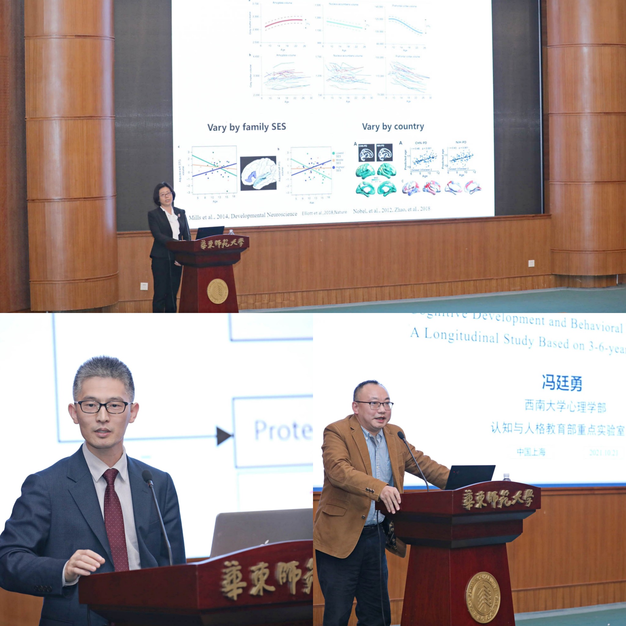 在“儿童脑发育与认知发展”主题研讨中,北京师范大学认知神经科学与学习国家重点实验室、儿童青少年脑智研究中心主任陶沙报告了北京队列研究项目为期五年的研究成果,她强调从科学问题出发采集数据在整个研究中重要价值,并提出了大队列研究面临的问题和挑战。上海儿童医学中心儿童脑科学中心王广海研究员从多个维度探讨并强调睡眠时间与质量对儿童发展的重要影响,并分享了团队研究对上海市小学生早课安排时间的重要指导价值。最后,西南大学心理学部教授、认知与人格教育部重点实验室副主任冯廷勇作了关于3-6岁幼儿心理与行为发展的追踪研究成果,报告了其团队在4-6岁的幼儿中执行功能比情绪理解更能促进同伴关系的形成,而执行功能的初始水平和发展速度能够预测个体在群体中的接纳或者拒绝的发现。