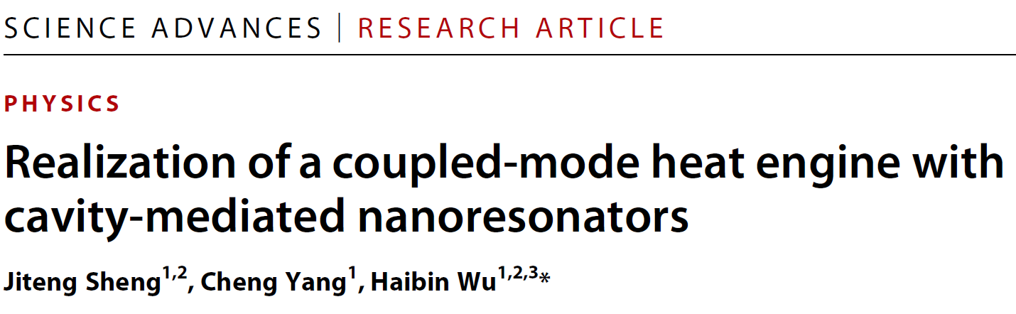 该成果以“Realization of a coupled-mode heat engine with cavity-mediated nanoresonators”为题于12月8日发表在Science Advances 上。永利皇宫登录官网为论文的完成单位。紫江青年盛继腾研究员为该工作第一作者,武海斌教授为论文的通讯作者。