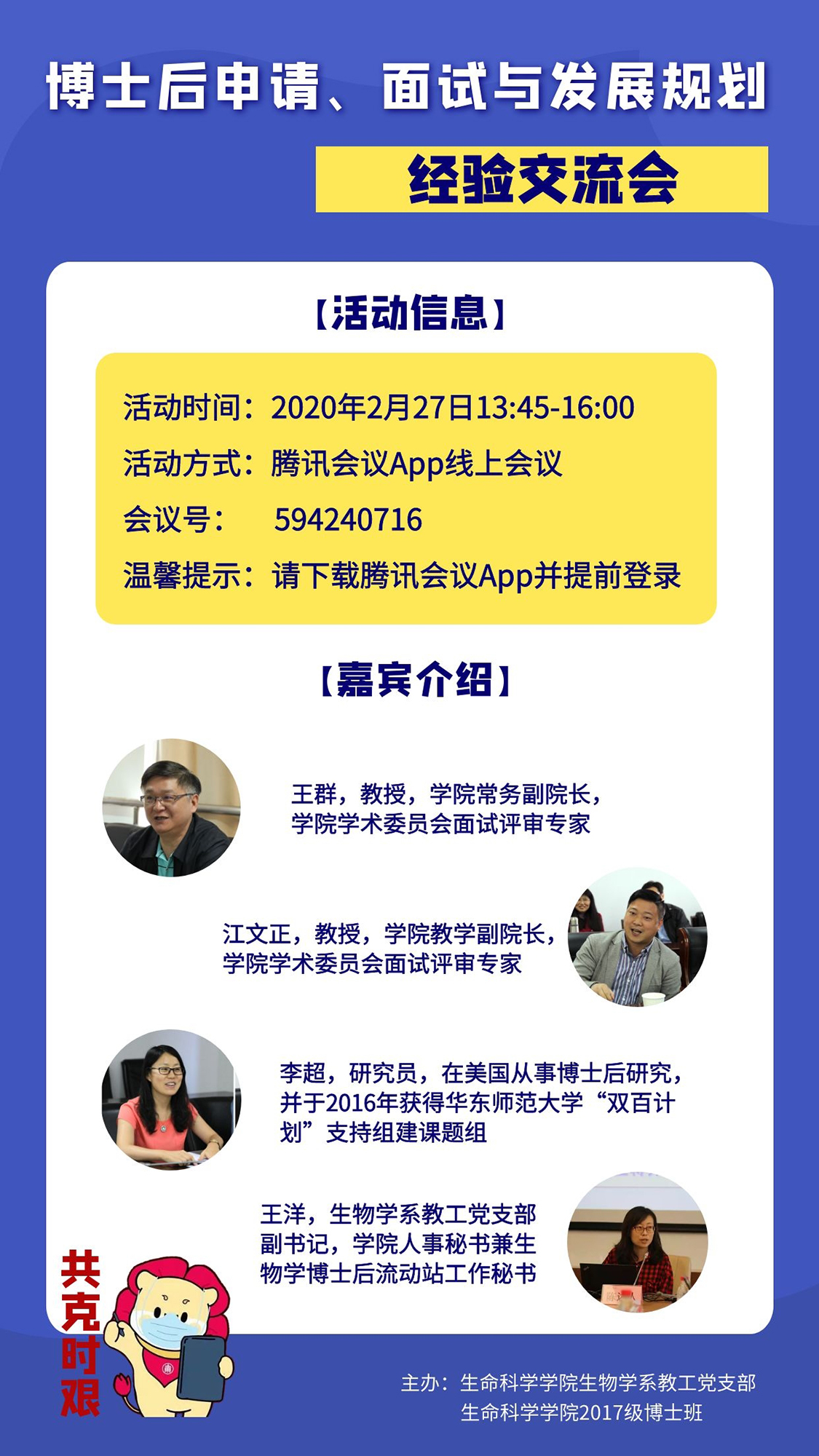 疫情期间,生命科学学院辅导员团队也在线上继续推进学生论文、就业、毕业等各项工作,关注学生心理健康,在为毕业生筛选、推送空中宣讲和线上招聘信息的基础上,重点面向博士毕业生,以博士毕业生就业落户政策解读、博士后申请面试与发展规划等学生特别关注的话题,邀请校学生职业发展中心职业规划师及学院领导、知名教授、生物学博士后流动站教师作为主讲嘉宾,分别于2月24日和2月28日举办两场线上求职就业经验分享讲座。