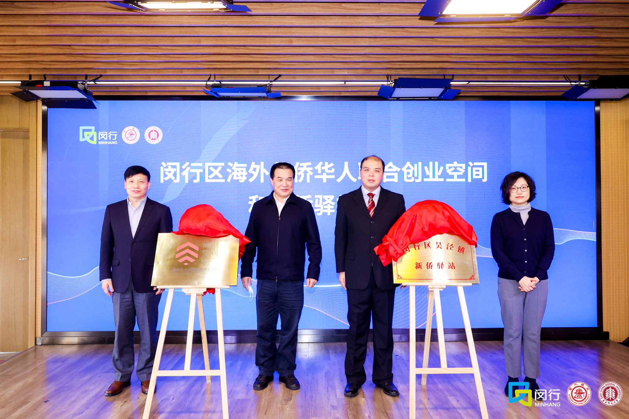 闵行区海外华侨华人联合创业空间和新侨驿站揭牌(闵行海外联谊会会长吴继华、吴泾镇党委书记金海民、闵行海外联谊会副会长陈超、吴泾镇党委副书记吴音英共同为阵地揭牌)