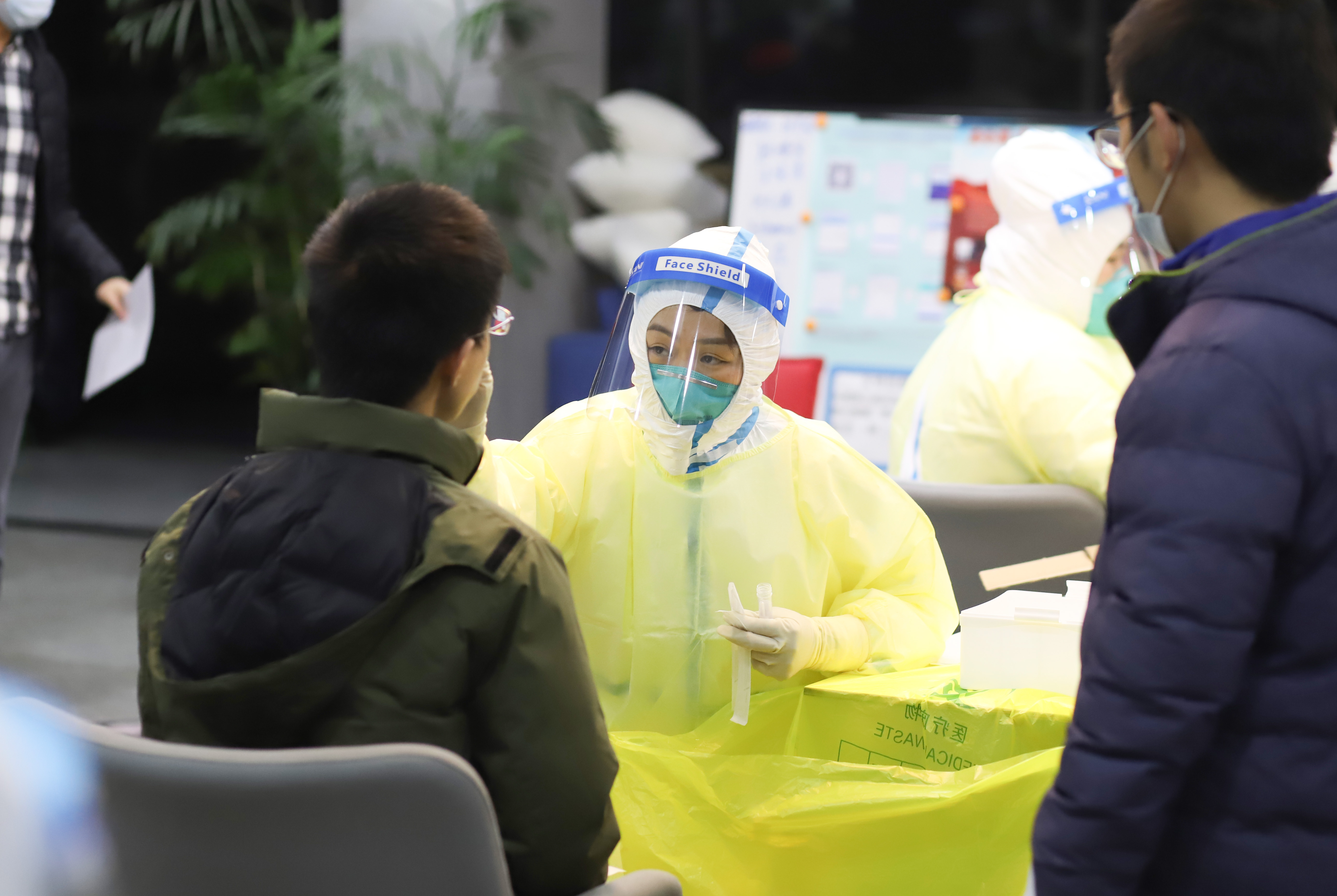 第五宿舍一楼医护人员正在进行核酸检测工作
