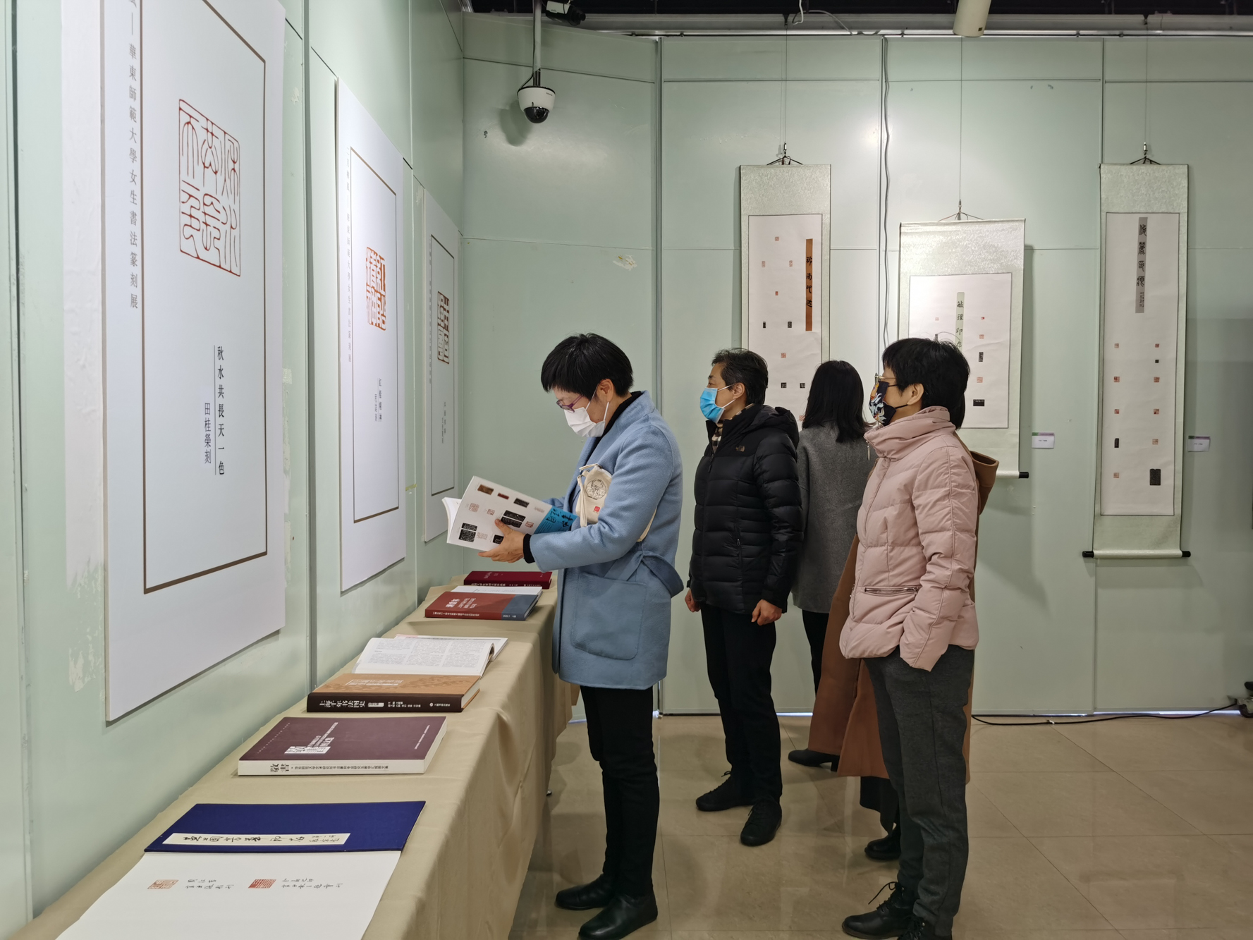 展览现场还设立了书法篆刻导览和体验区。一张张方桌上篆刻工具齐备,女性师生可亲手体验篆刻的乐趣。美术学院书法系女教授顾琴一边篆刻,一边介绍相关知识,普及篆刻艺术。物理与电子科学学院女教授李恺是第一次接触篆刻,她完成了自己的第一个作品——李字。“太开心了!今天的活动让我感到篆刻艺术十分有趣。”