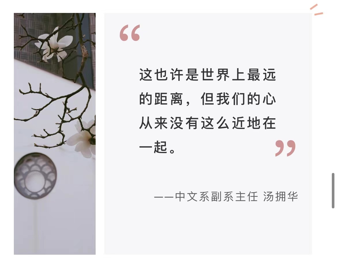 活动策划者之一、大夏书院辅导员曹安琦介绍道:“老师们的热情令我们感到十分惊喜,除了一段段接地气、有温度的文字之外,还有老师分享了书籍、音乐、摄影作品,从各自专业的视角与个人的经历出发,和学生一起观照疫情下的种种变化,传达了坚定而踏实的力量。”