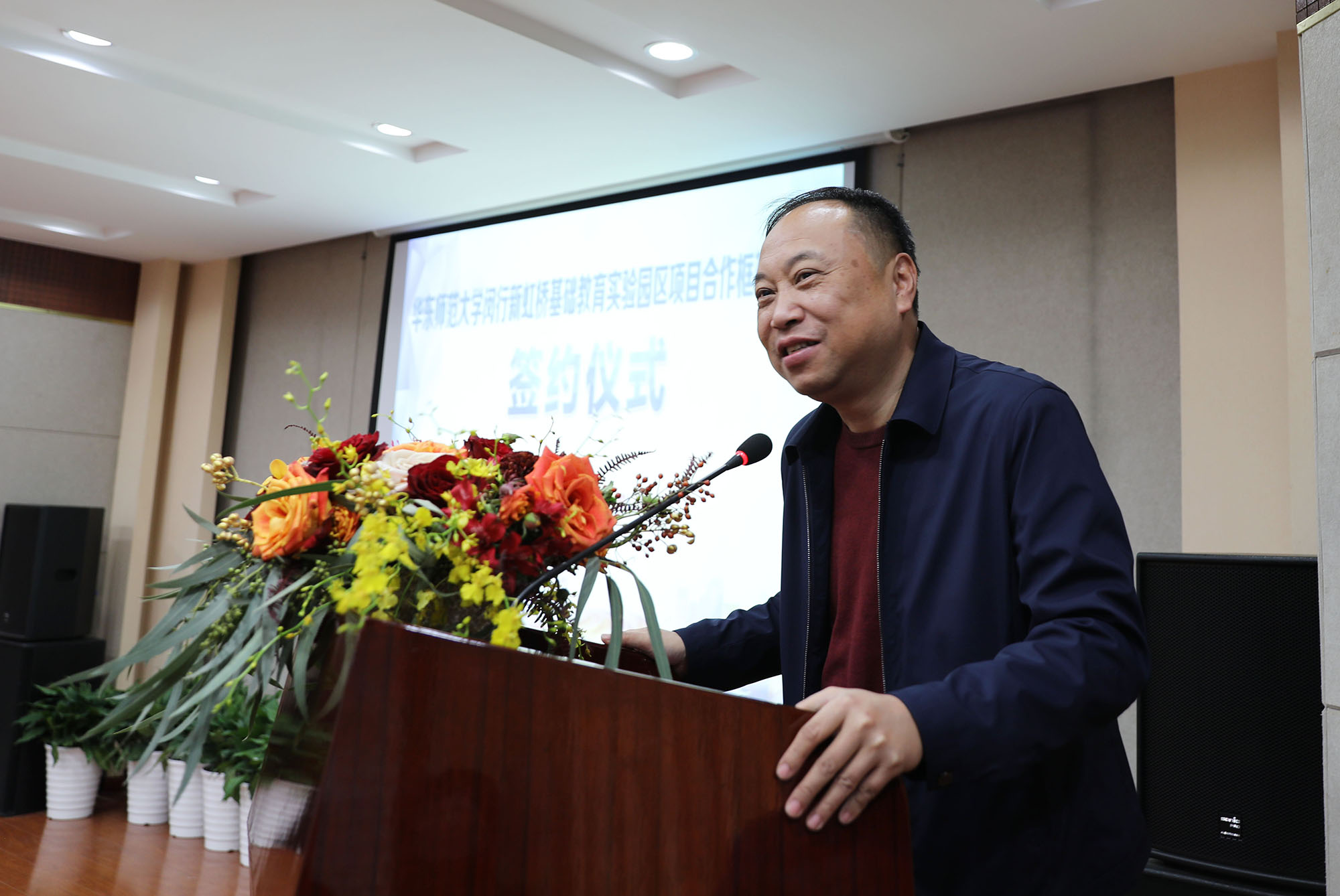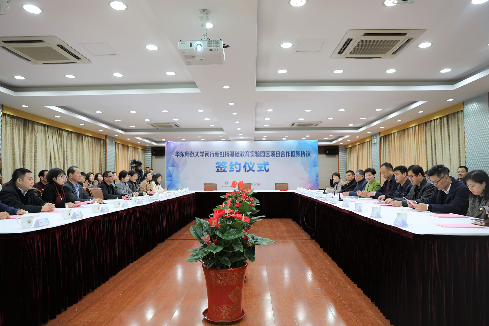 华东师大副校长兼基础教育与终身教育发展部部长、教育集团主任戴立益,教务处副处长苟健,基础教育与终身教育发展部副部长施洪亮、冯剑峰、刘萍,闵行区副区长杨德妹,虹桥商务区管委会副主任付乃恂,华漕镇党委书记吉玉萍,镇党委副书记、镇长王尧,以及华漕镇的校园长代表和相关单位负责人等共同出席。签约仪式由闵行区教育局局长恽敏霞主持。