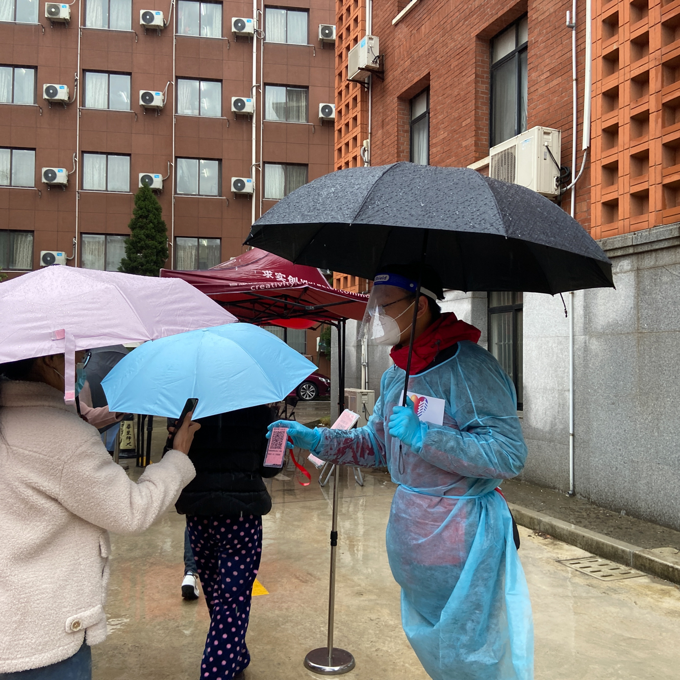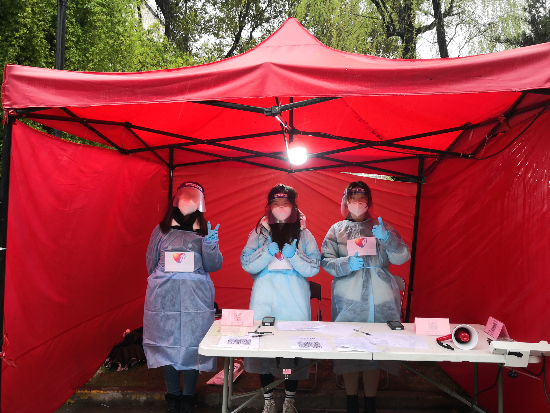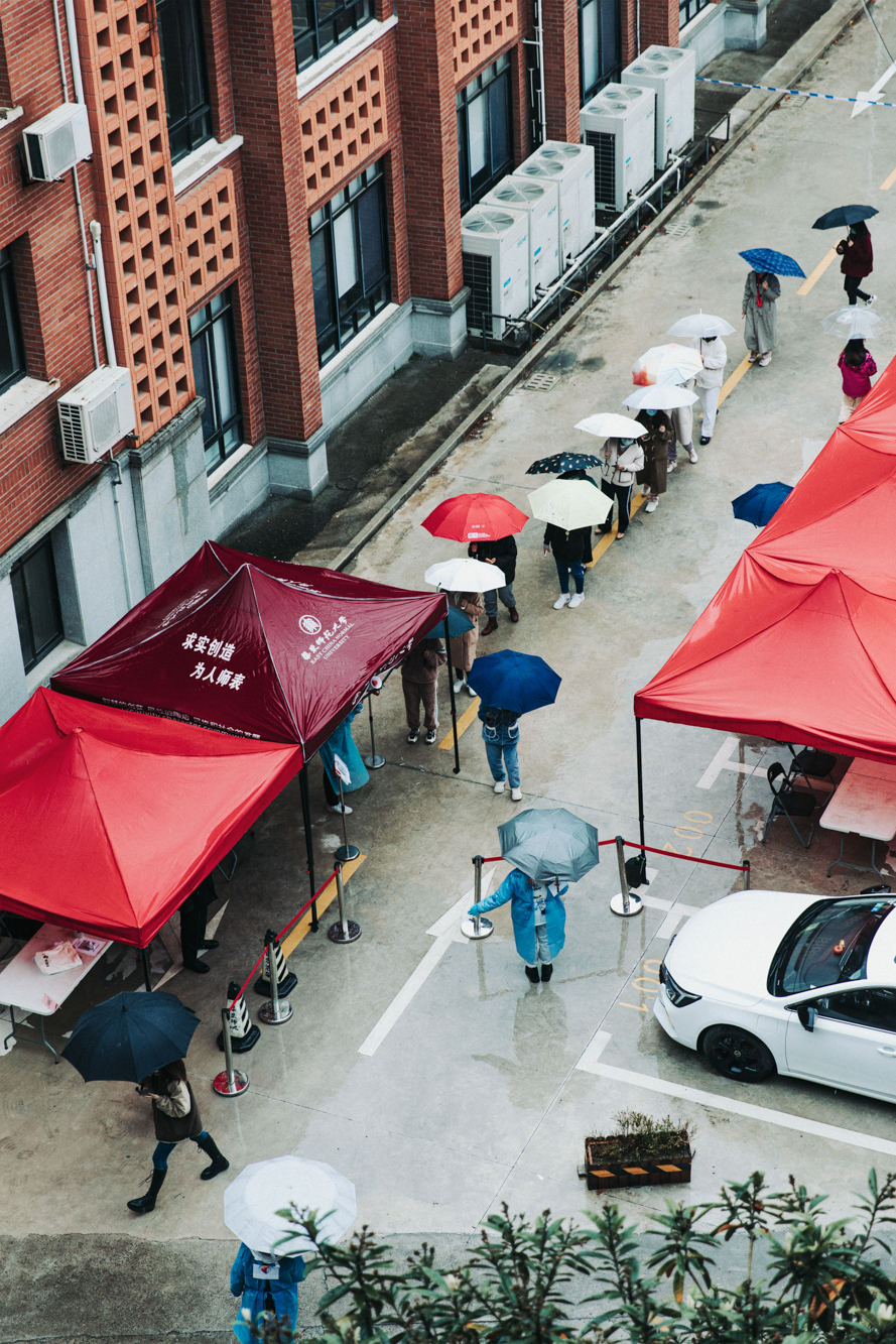 3月20日开始,普陀校区开展“7+7”封闭管理。420名志愿者冒着大雨引导万余名同学进行核酸检测,分批次、分点位从11点运转到晚上6点。6点半开始,他们又马不停蹄将同学们申请的必需药品分别送至宿舍楼下。