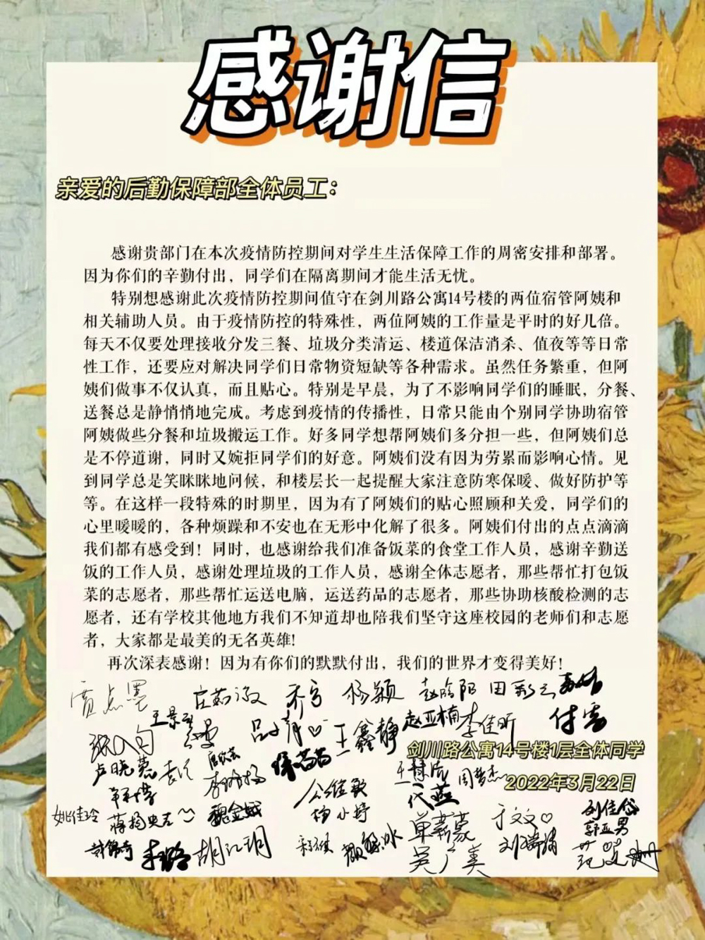 连日来,同学们给后勤员工送上多封感谢信