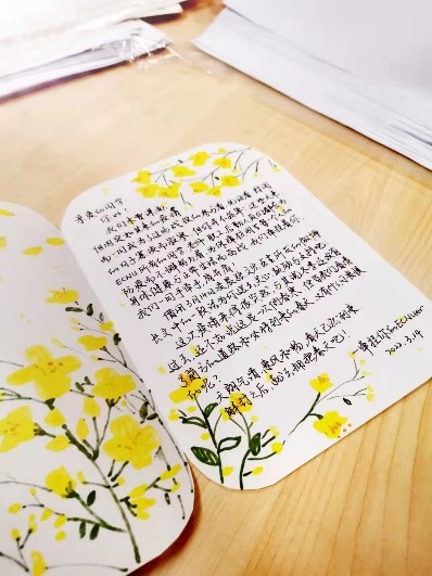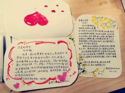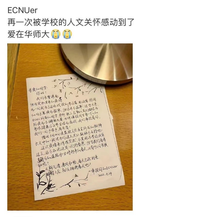除了冲在一线的先锋部队,各级团组织还发起“见字如面——团团为你传递爱”活动,鼓励同学们以一句话、一封信、一张卡的形式,为每一位正在被隔离的ECNUer送去温暖,缓解焦虑情绪,送上暖心祝福。收到这份惊喜,有同学表示,再一次被学校的人文关怀感动到了,体会到真正的“爱在华东师大”。
