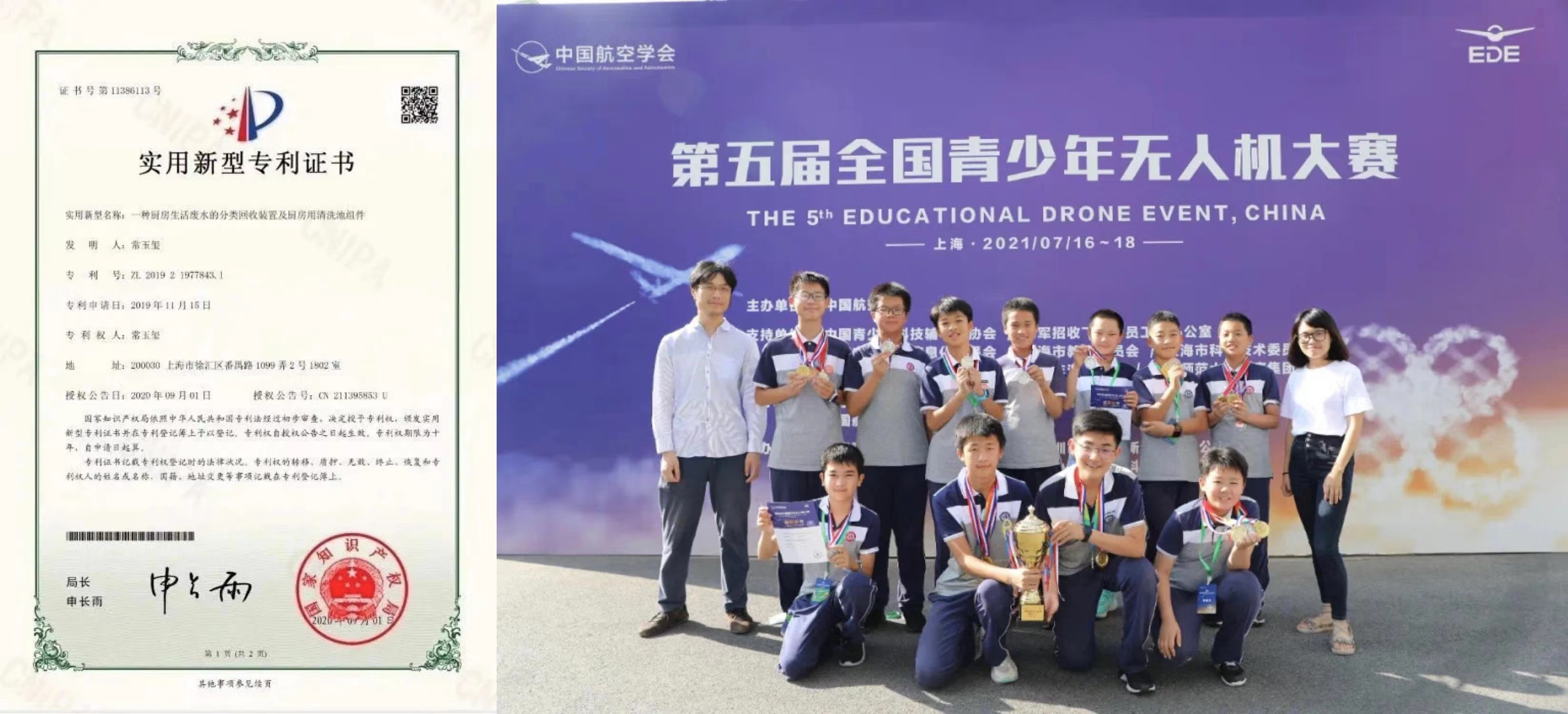 左图:学生专利获得授权;右图:成功举办第五届全国青少年无人机大赛,科技社团斩获佳绩