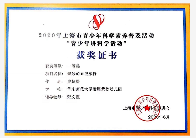原怀瑾获上海市青少年科学素养普及活动幼儿园组唯一的一等奖