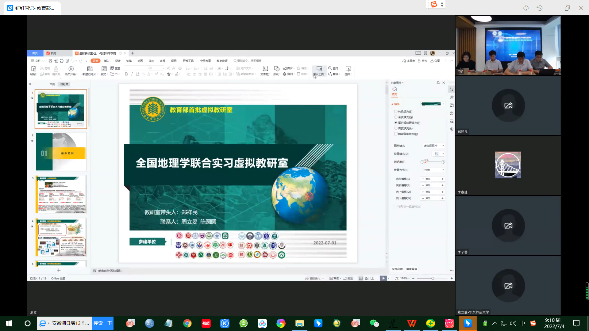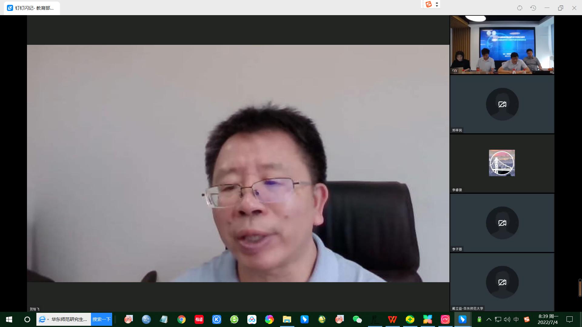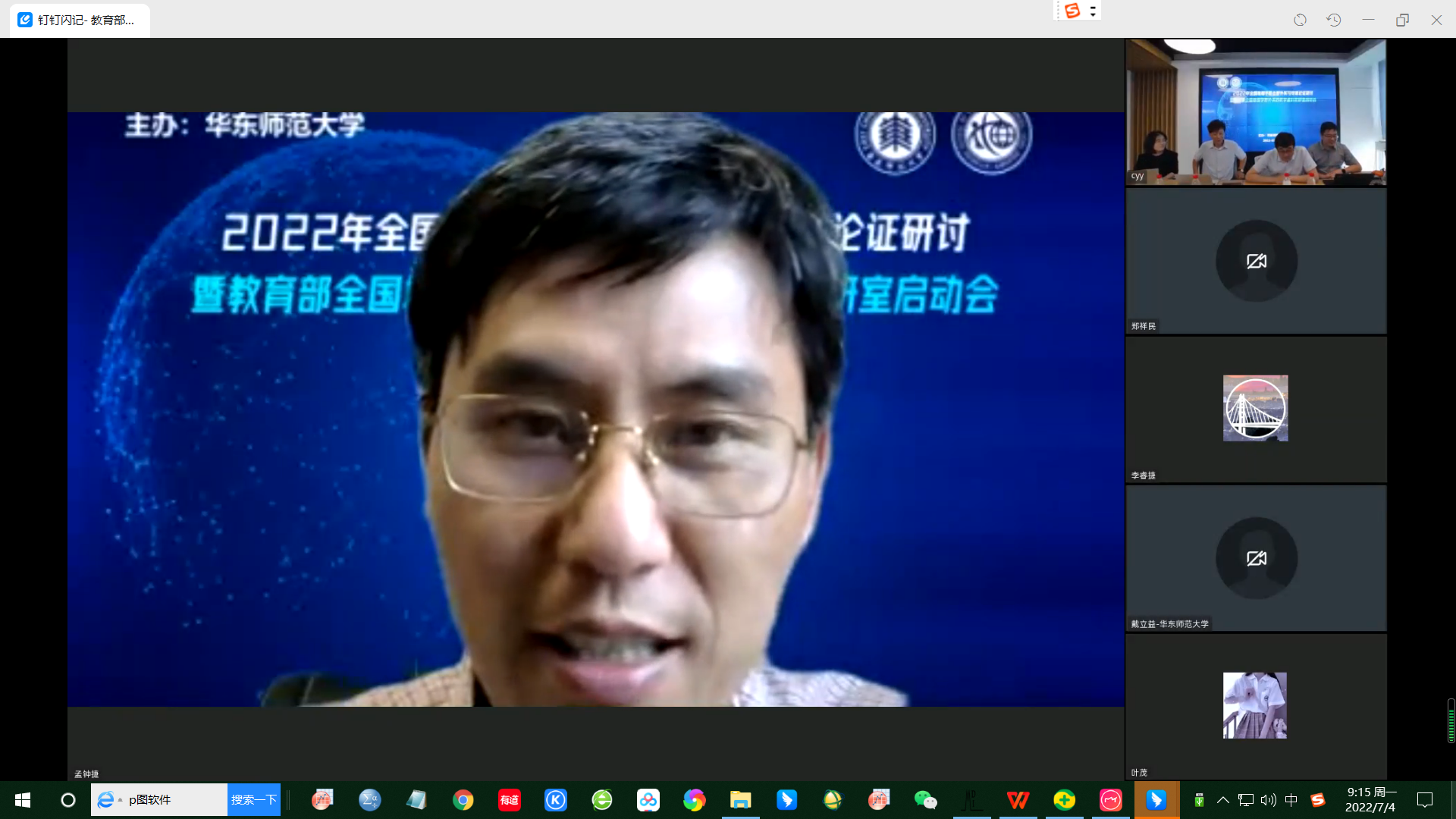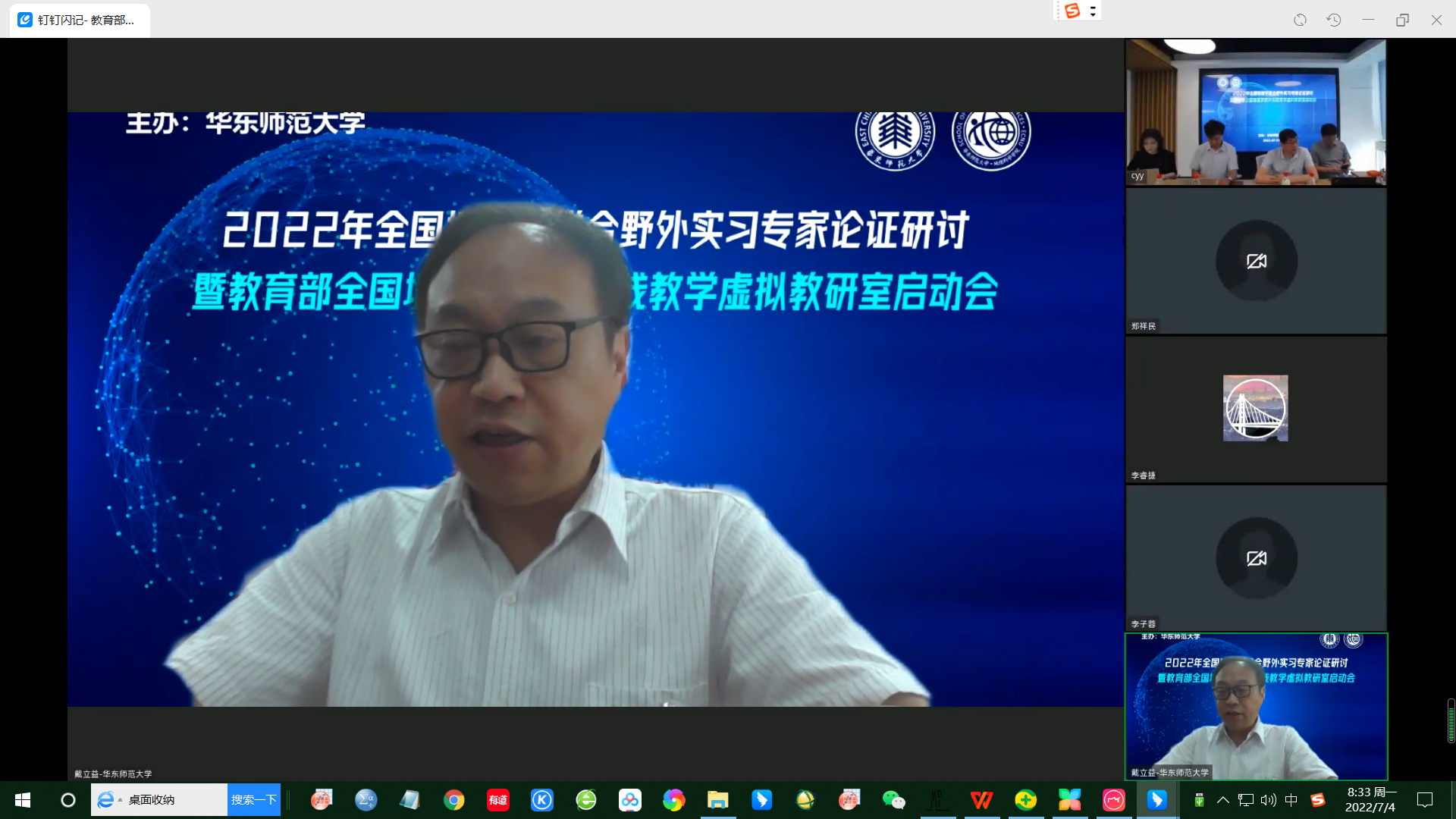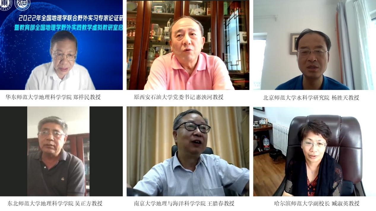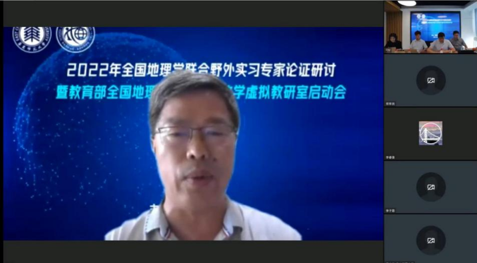 7月1日下午,由华东师大主办的2022年全国地理学联合野外实习专家论证研讨暨教育部全国地理学野外实践教学虚拟教研室启动会通过线上会议形式举行。教育部地理学教指委主任、北京大学城市与环境学院院长贺灿飞教授,教育部地理学原教指委副主任、西安石油大学原党委书记惠泱河教授,教育部地理学教指委委员、鲁东大学校长王庆教授,中国地质大学(武汉)副校长王华教授,永利皇宫登录官网副校长戴立益教授,永利皇宫登录官网教务处处长、招生办公室主任孟钟捷教授,全国大学生地理学野外实践教学联盟各理事单位的主管副校长、院长、党委书记和负责教师,教育部各地理学教指委委员,教育部特聘野外指导专家组成员及国内四十个高校单位的专家、教授和师生们共148人参加了会议。永利皇宫登录官网地理科学学院院长刘敏教授和永利皇宫登录官网地理科学学院郑祥民教授分别主持了教育部全国地理学野外实践教学虚拟教研室启动仪式和第十三届全国地理学联合实习线路论证及专家论证研讨环节。