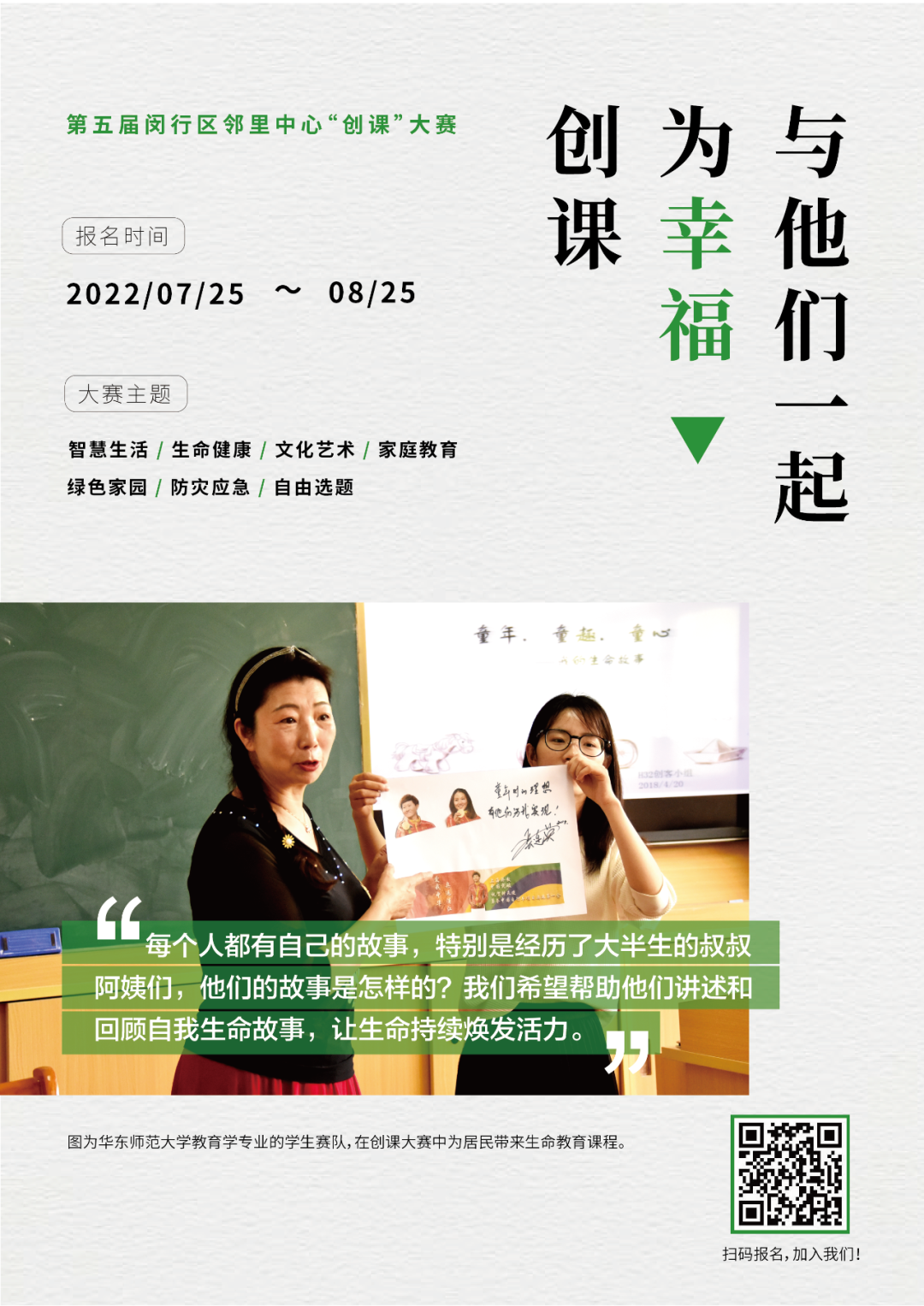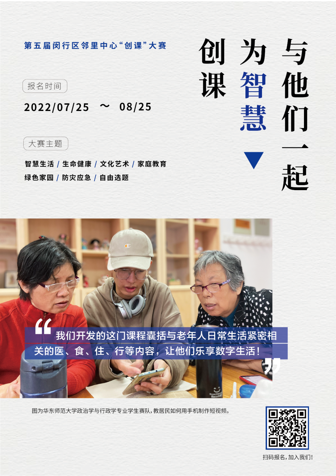 在党的二十大即将召开之际,为进一步贯彻落实国家及上海市《教育现代化2035》提出的“构建服务全民终身学习的现代教育体系”精神,以及《上海市终身教育发展“十四五”规划》、《上海市老年教育发展“十四五”规划》目标要求,闵行区携手永利皇宫登录官网等高校,启动第五届闵行区邻里中心“创课”大赛。