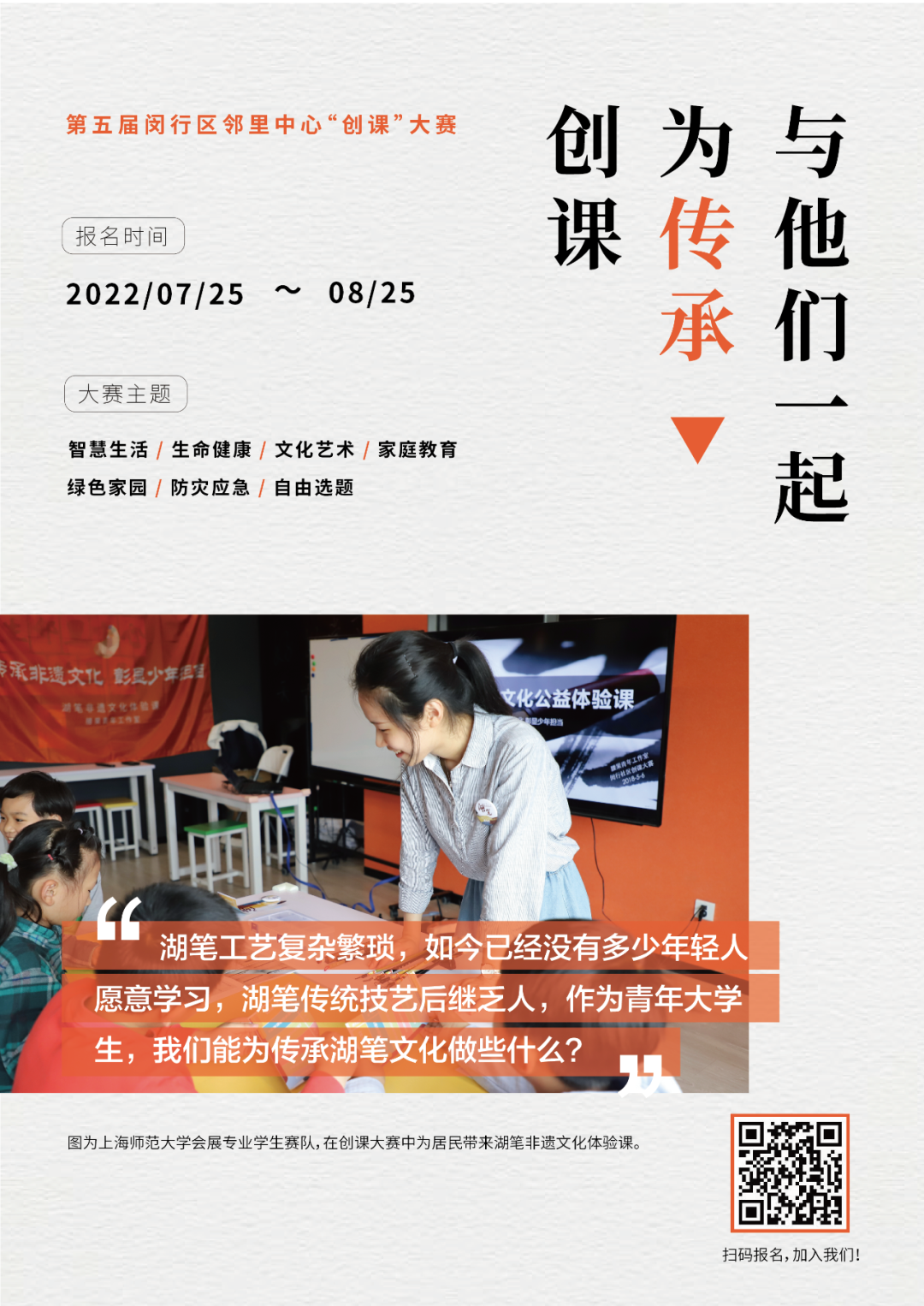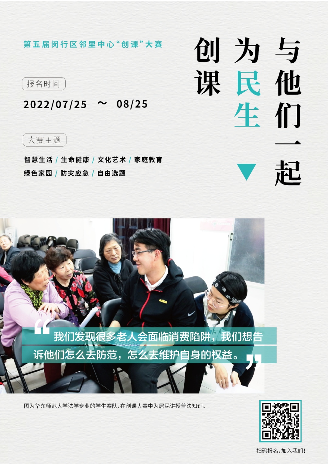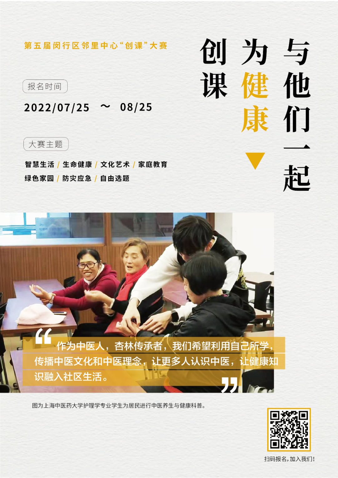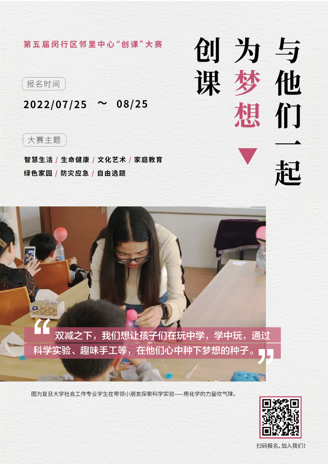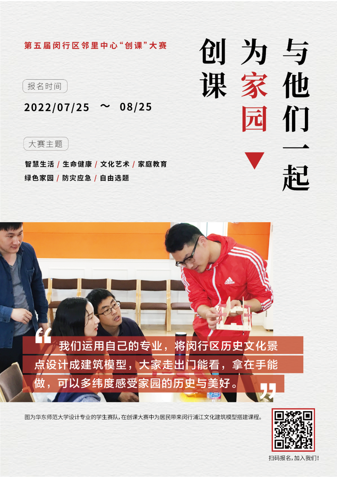 青年担当,创课先行。关注民生,服务社区。海量课程,由你开发。第五届闵行区邻里中心创课大赛启动招募,快来加入!