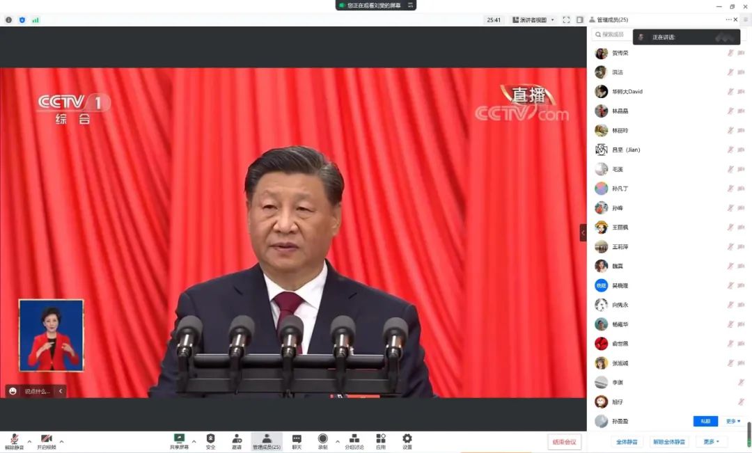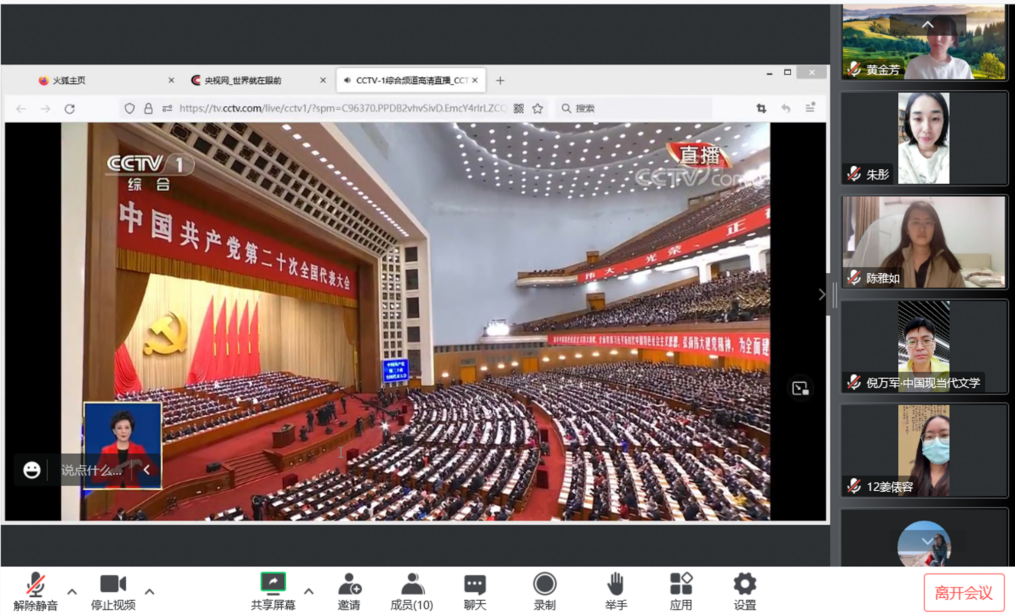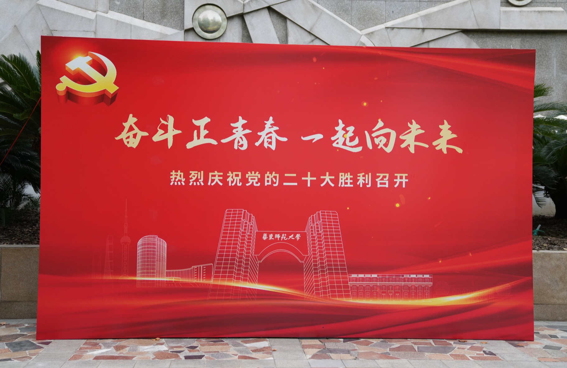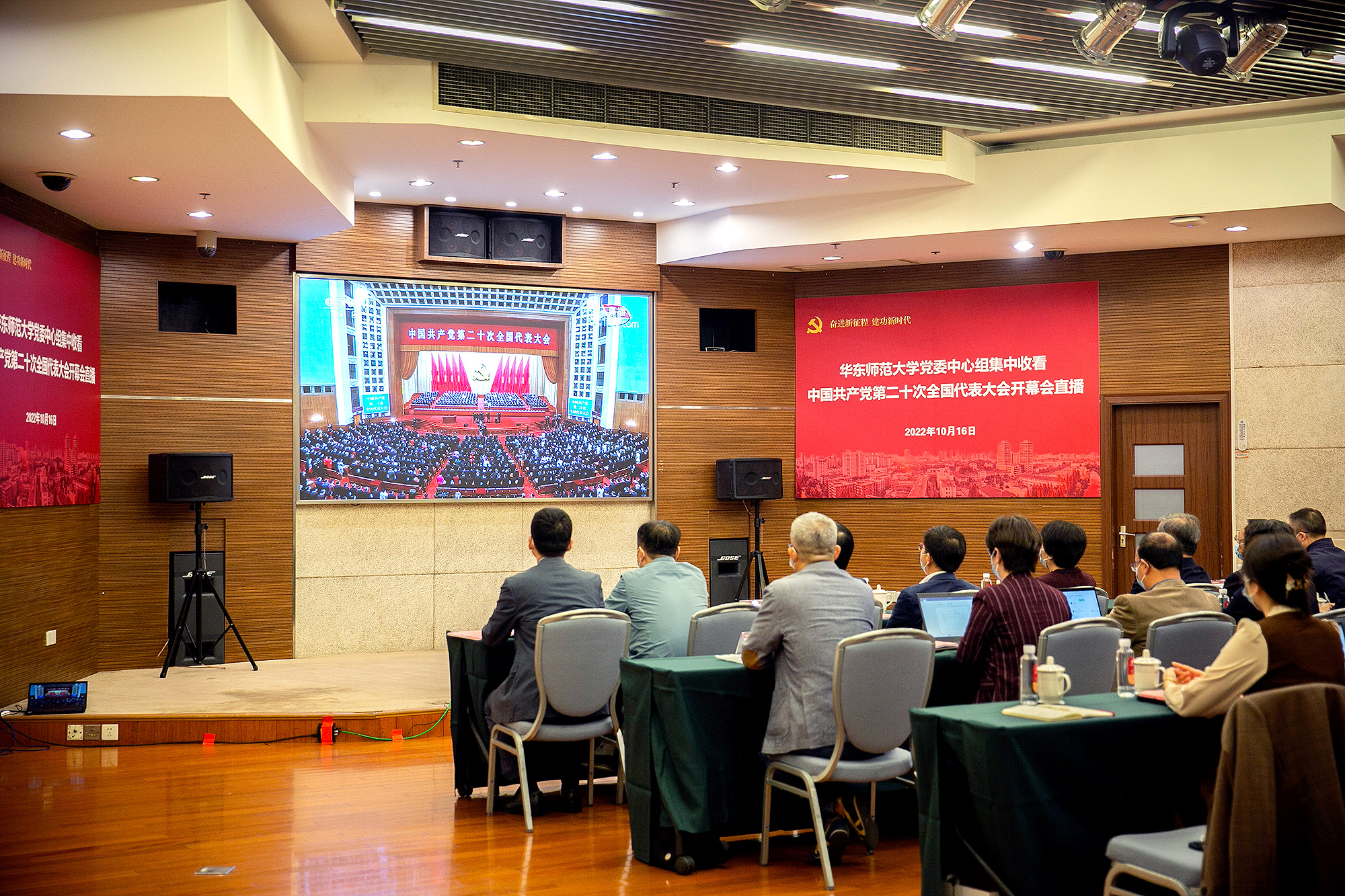 华东师大两校区红旗招展,“热烈庆祝党的二十大胜利召开”的展板分外鲜明,上午10点不到,师生们早早来到屏幕前收看开幕会盛况。华东师大师生或在各会议室、办公室、实验室等公共空间,或在宿舍、家中收看开幕会盛况,一些院系党组织通过开设网络会议室集中收看,关注热议总书记报告。在总书记的报告过程中,收看现场不时自发响起热烈的掌声。