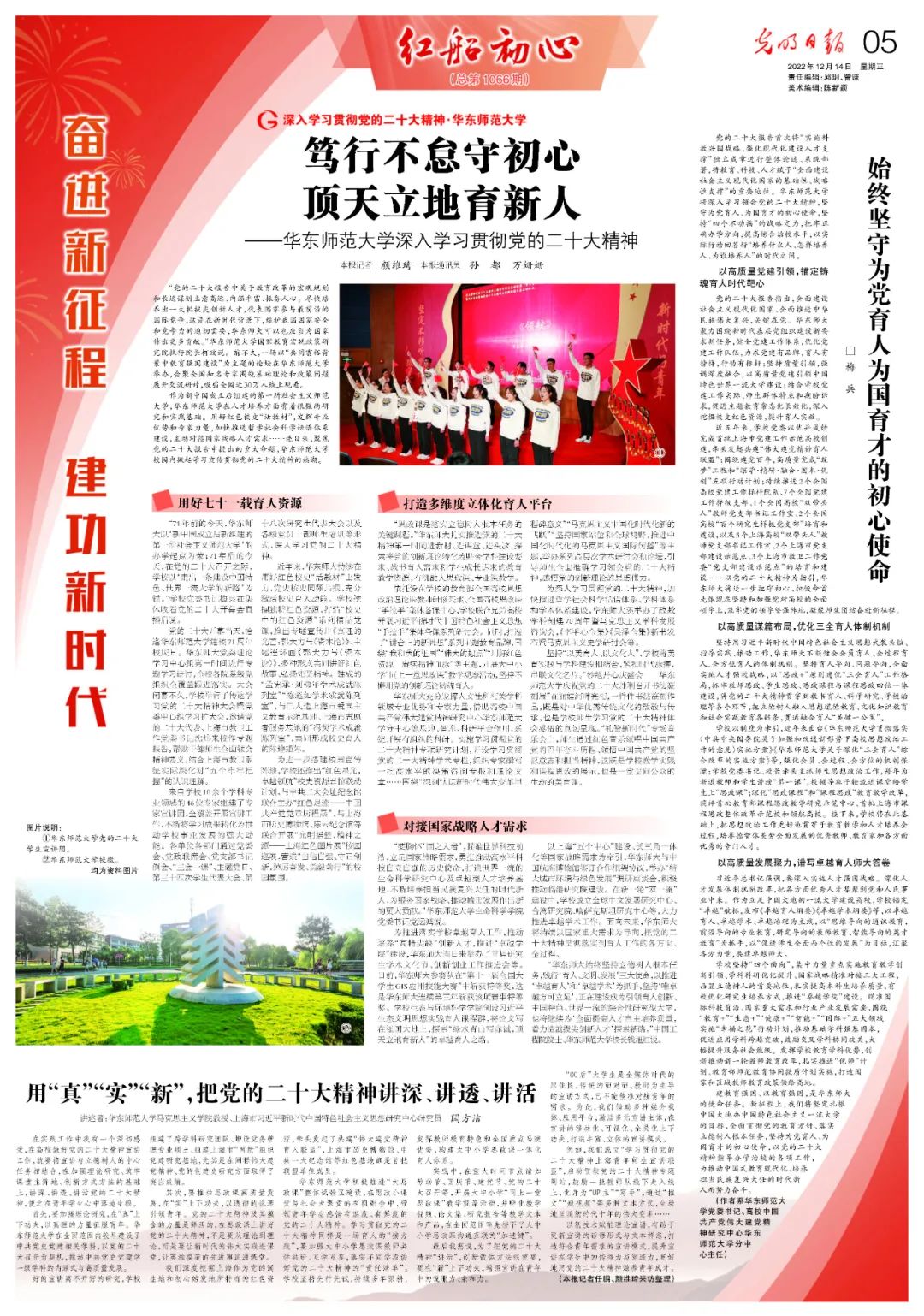 一是在宣讲队伍建设上下功夫。“新时代宣讲团”以马克思主义学院、孟宪承书院、政治学系、教育学部等相关优势学科专业背景的本硕博团员青年为主体,遴选创新创业团队、研究生支教团、进博会志愿服务队、社会实践先进集体中优秀青年代表加入,以使命与担当为着力点,结合自身经历,将党的二十大精神融入内心,讲出青年的责任感与使命感。同时,邀请附属小学、中学的优秀少先队员和共青团员代表以及优秀青年教师参与宣讲团,从不同视角讲好党的二十大精神。