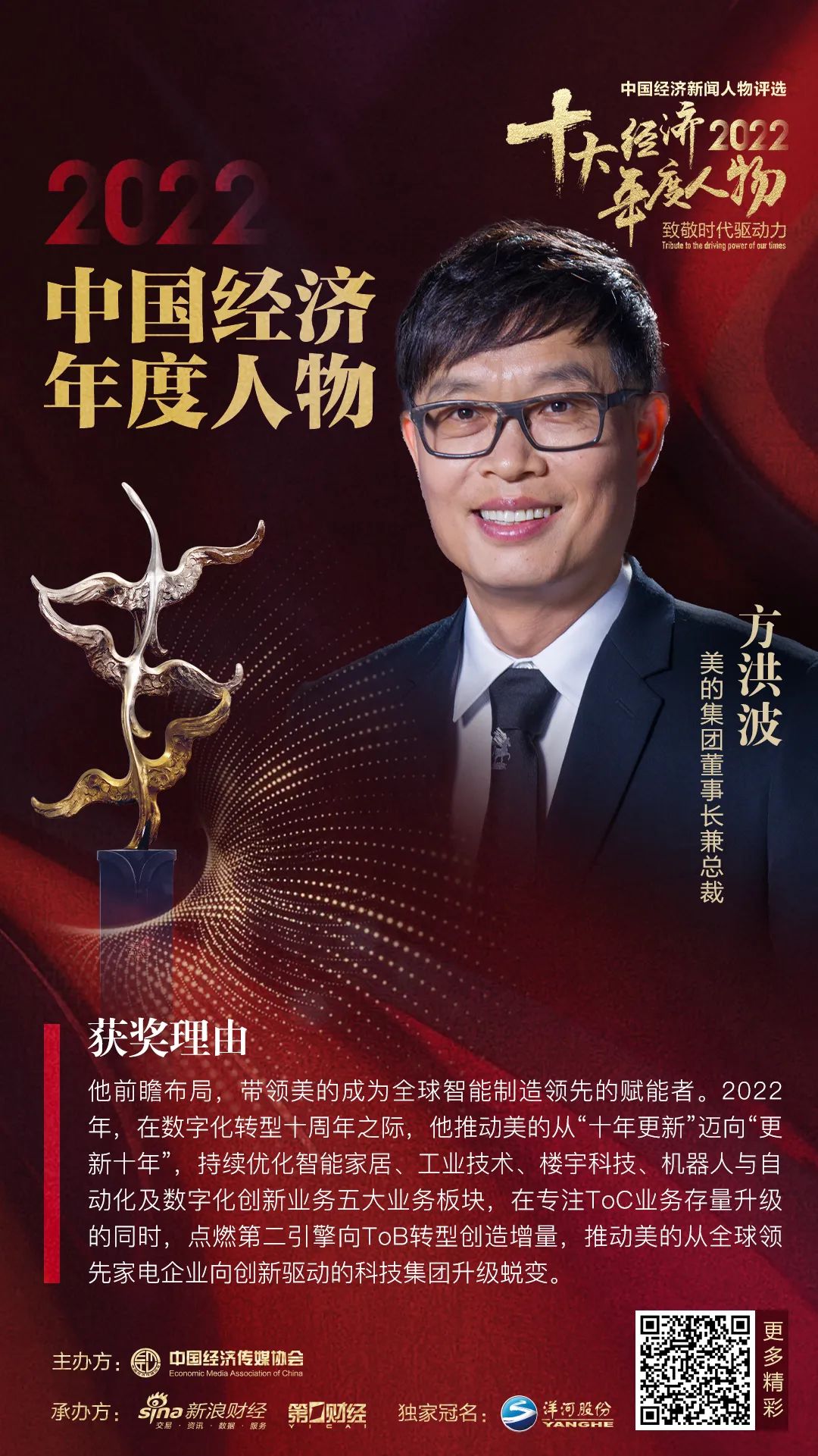 在获奖感言中,方洪波表示:“美的是伴随中国改革开放不断成长,发展壮大起来的,是这个大的时代背景给了我们非常好的发展机遇。……在整个国家科技强国、制造强国的大的时代背景下,我们会抓住下一个周期的良好发展机遇,不辜负这个伟大的时代。”