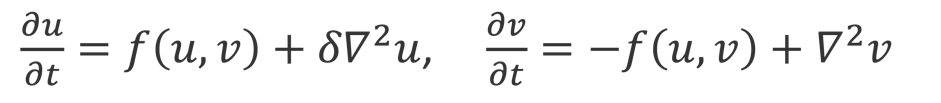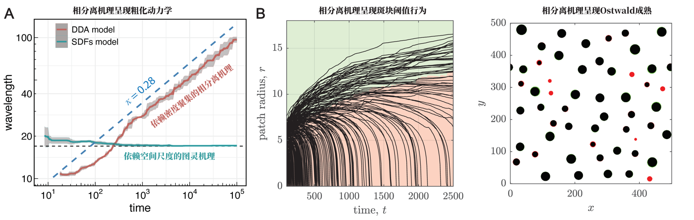 图2:保守型偏微分方程呈现幂律粗化行为和Ostwald成熟现象。(A)特征尺度的粗化行为。图中DDA为提出的广义保守相分离模型,而SDFs为经典的图灵自组织组理论模型;(B)Ostwald成熟是相分离的关键特征之一,不同斑块融合导致空间较大斑块拥有指数为0.28的幂律粗化行为。