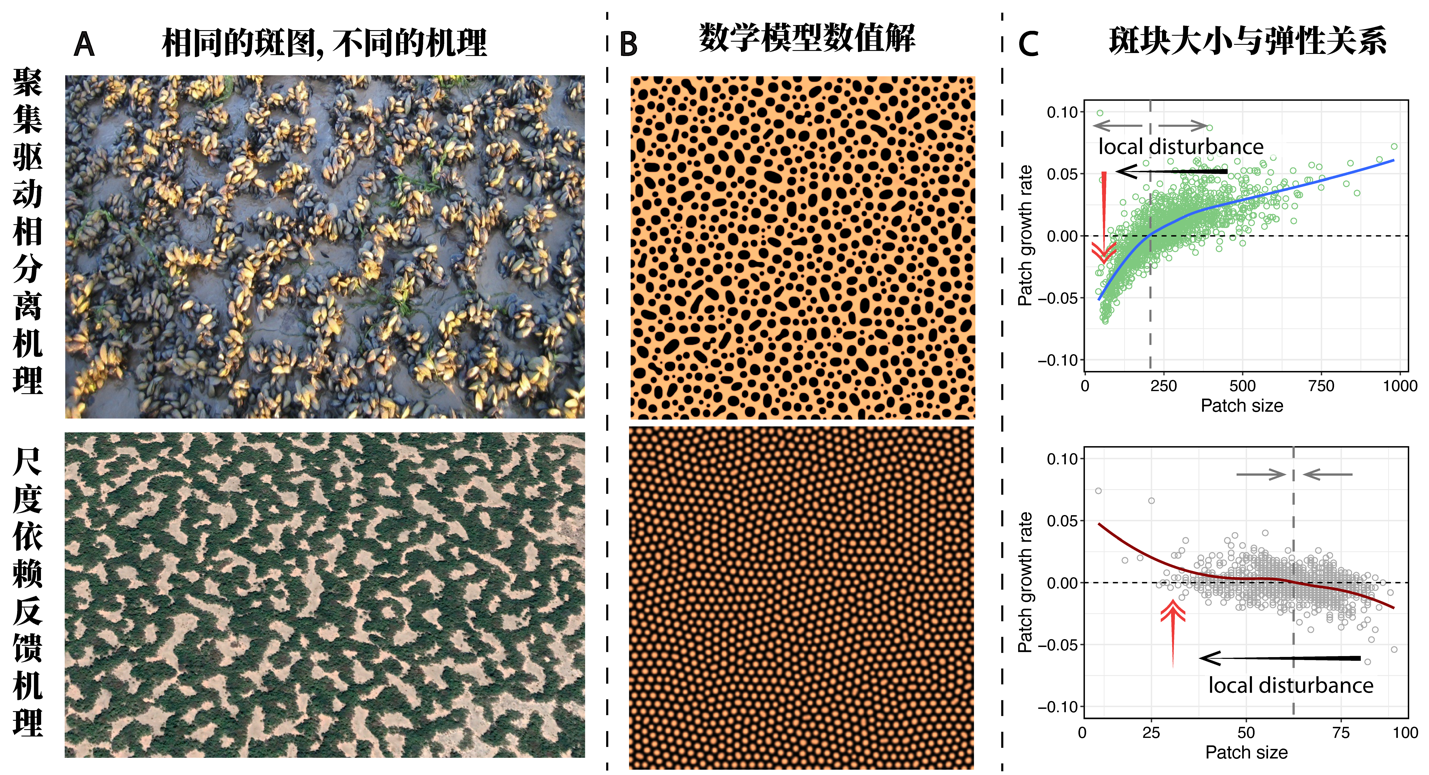 图3:相同的空间自组织斑图,却隐含了不同的形成机理和弹性功能。(A)不同的系统呈现相同的自组织斑图;(B)描述了提出的广义保守相分离模型与经典图灵自组织模型形成的空间斑图; (C)描述了两种机理的生态系统弹性功能动力学。
