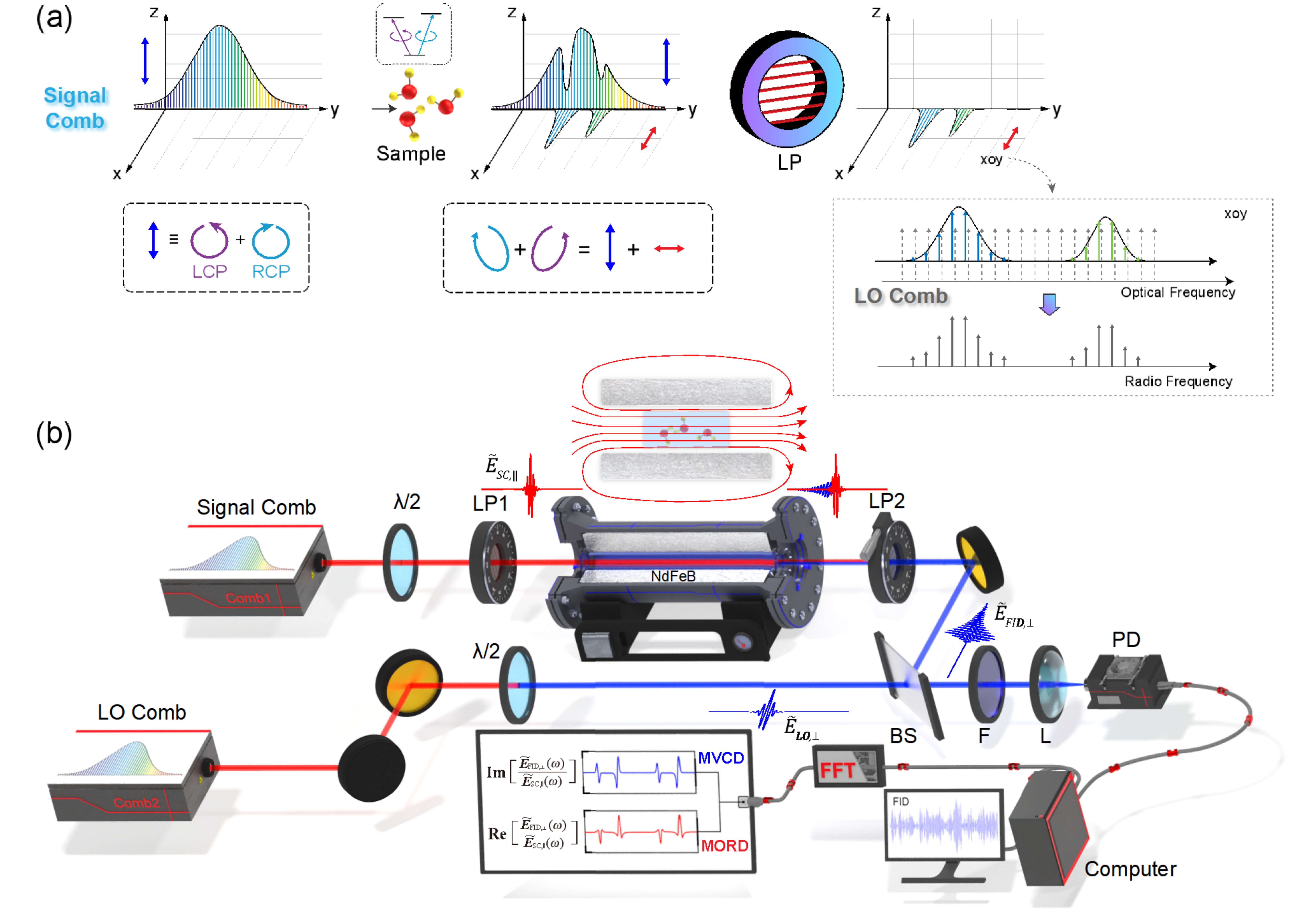 双梳-光学活性光谱的基本原理与实验装置(a)原理图;(b)实验装置图;