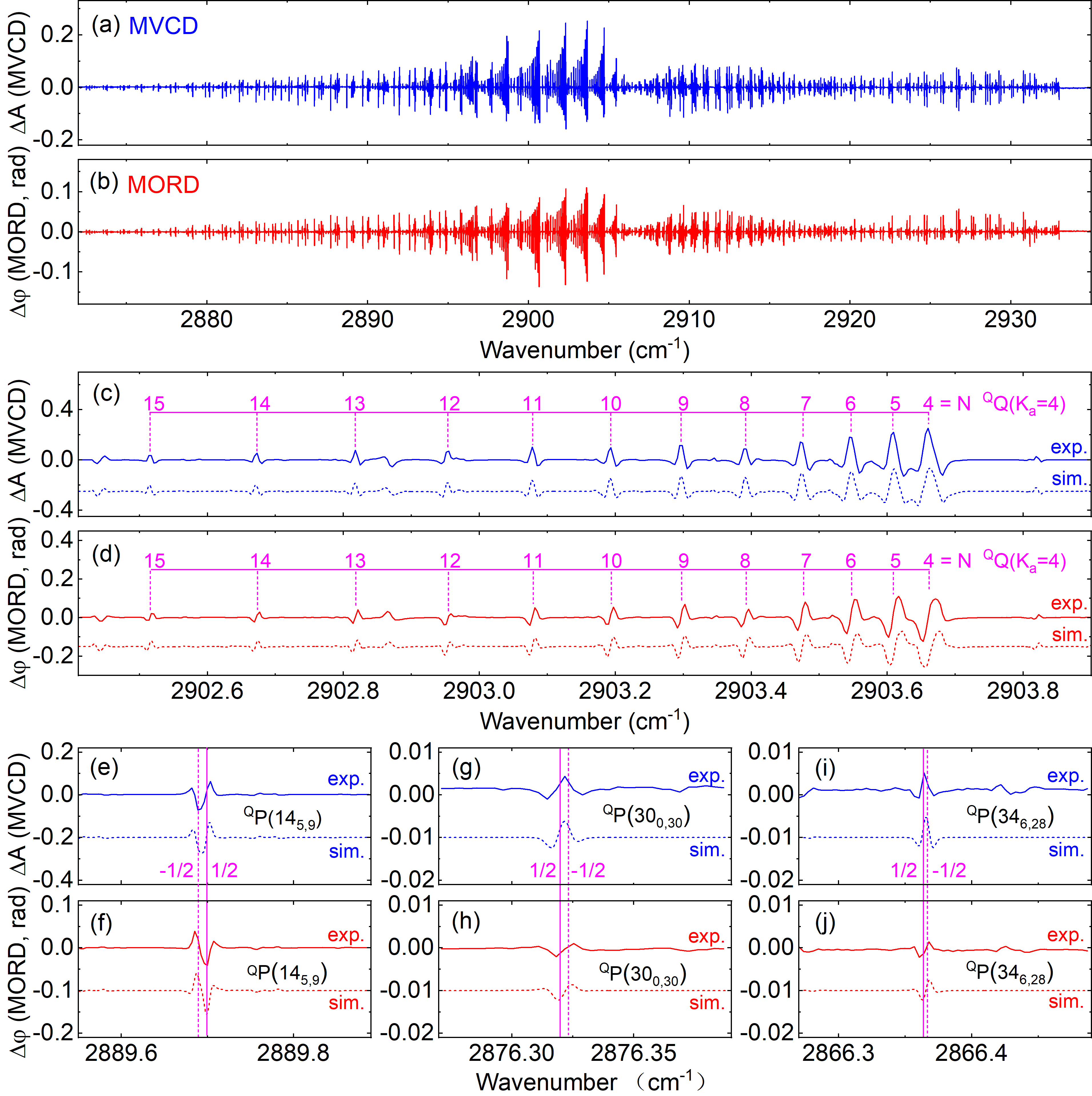 基于气相顺磁分子NO2的磁光活性响应,课题组演示了双梳-光活性光谱测量技术特性及优势,实现了覆盖NO2分子υ1+υ3振动带的旋转解析磁光活性光谱快速测量,包括磁振动圆二色光谱和磁旋光色散光谱。宽带磁光活性光谱信息在833μs的时间内获得的,梳齿结构的光谱分辨率达到108.4MHz,这对于气相分子的多普勒极限光谱测量非常有价值,有助于揭示顺磁分子的精细结构和磁场之间的相互作用。