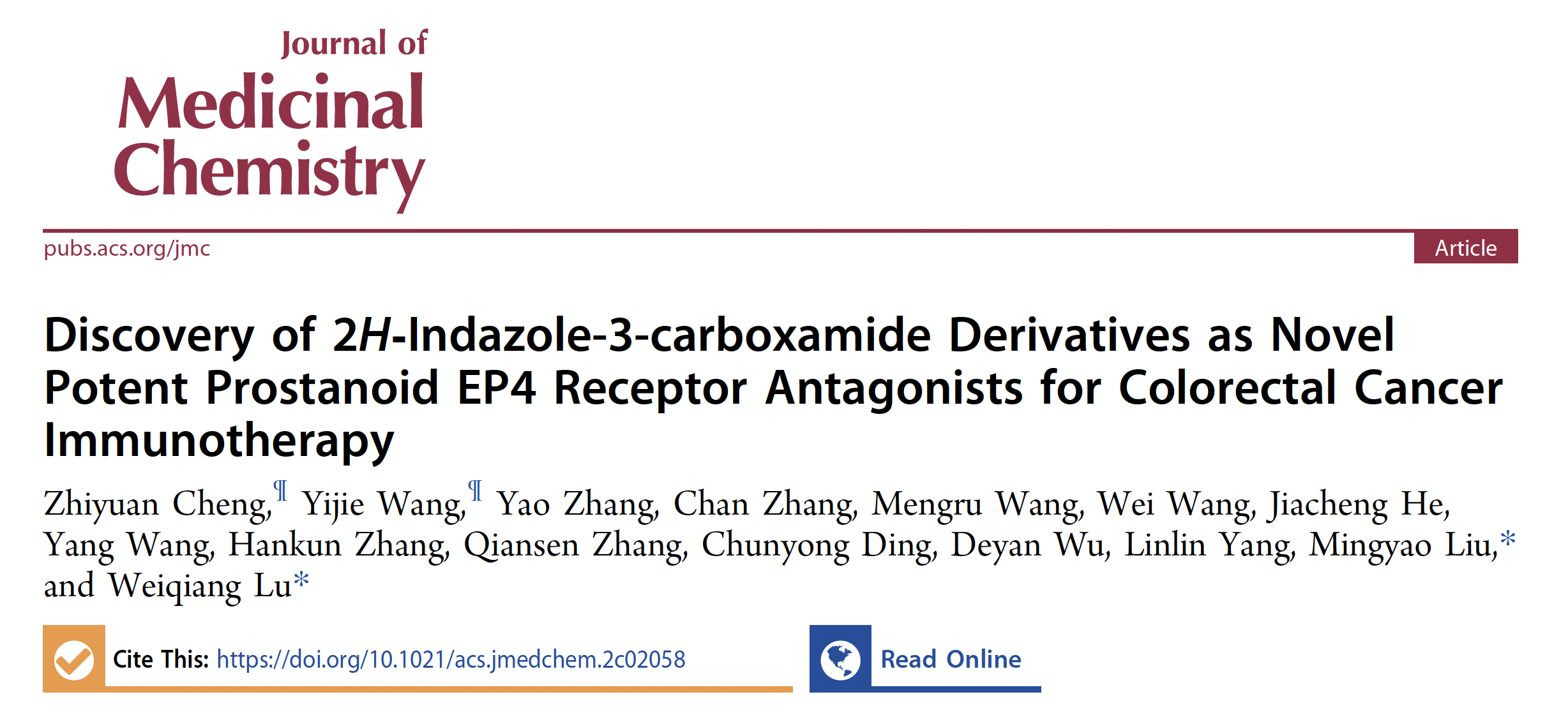 该成果近期以 Discovery of 2H‑Indazole-3-carboxamide Derivatives as NovelPotent Prostanoid EP4 Receptor Antagonists for Colorectal Cancer Immunotherapy 为题在线发表在药物化学领域国际顶级期刊 Journal of Medicinal Chemistry 上,并被选为期刊主封面(Front Cover)。永利皇宫登录官网生命科学学院博士研究生程志远和硕士研究生王义杰为本论文的共同第一作者,刘明耀教授和卢伟强研究员为本论文的共同通讯作者。该研究得到了上海交通大学丁春勇研究员,海南大学吴德燕教授,郑州大学杨琳琳教授以及本校张乾森研究员等合作伙伴的大力支持和帮助。