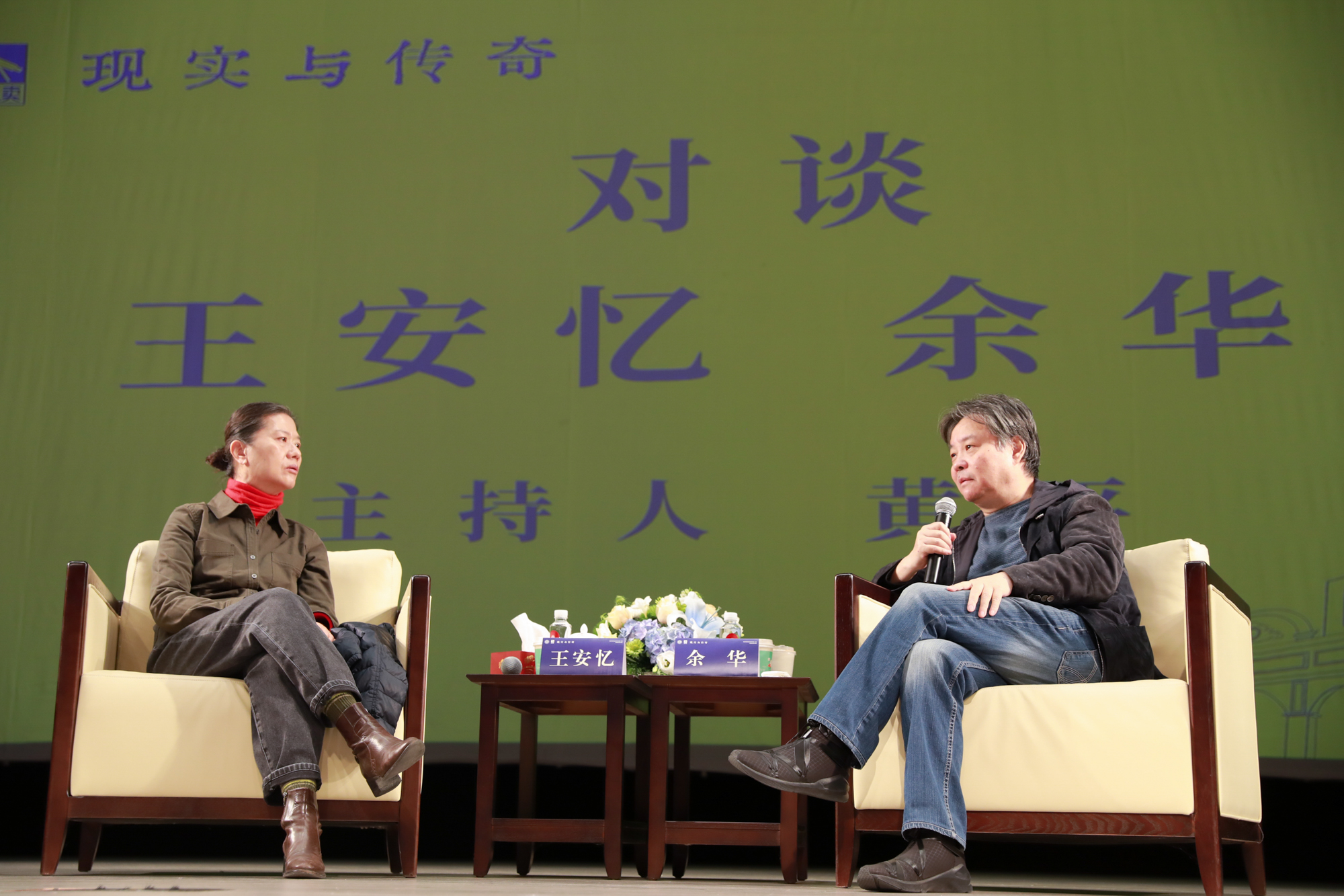 王安忆与余华的对谈由华东师大中文系教授、中国创意写作研究院副院长黄平主持。在黄平向观众隆重介绍两位作家后,余华回忆起在华东师大创作《活着》等多部作品的经历,王安忆也分享了自己与华东师大的故事。接着,两位作家就“现实”与“传奇”两个主题展开了对话。