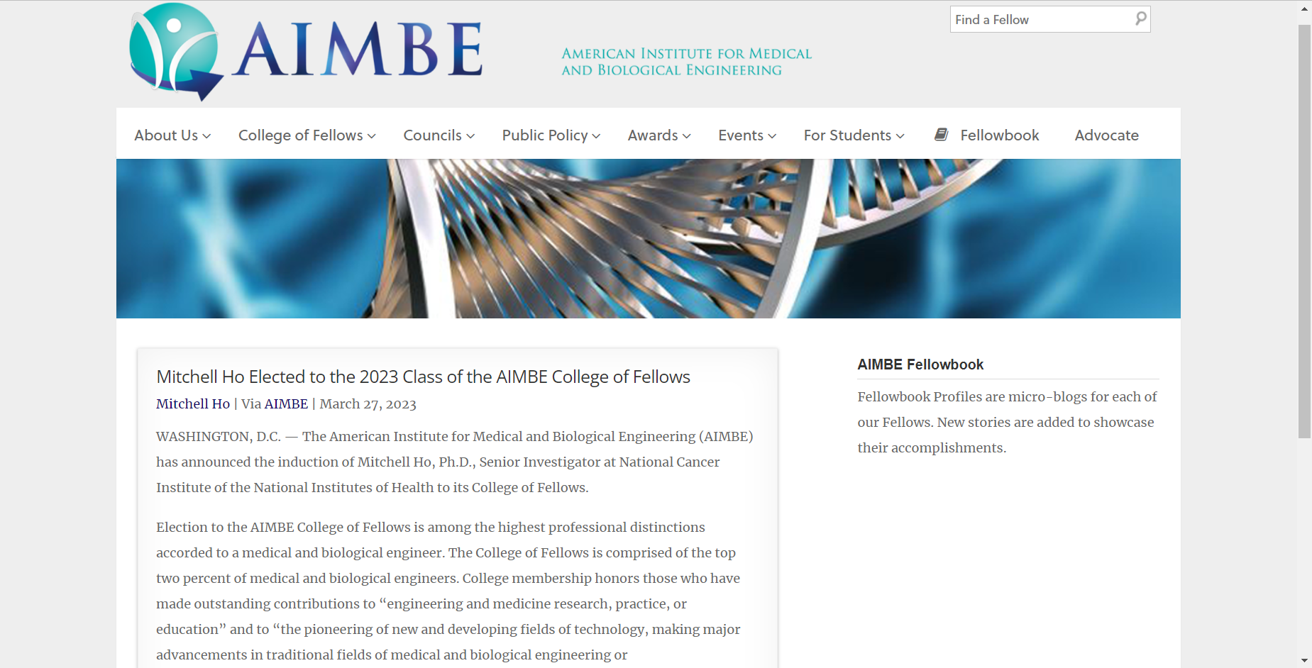 AIMBE院士由世界医学与生物工程领域最杰出(Top 2%)的学者组成,每年经过国际同行提名与严格评选产生,由现有的院士推荐,经两轮筛选最后经全体院士投票选举,是美国医学和生物工程技术领域的最高学术荣誉。