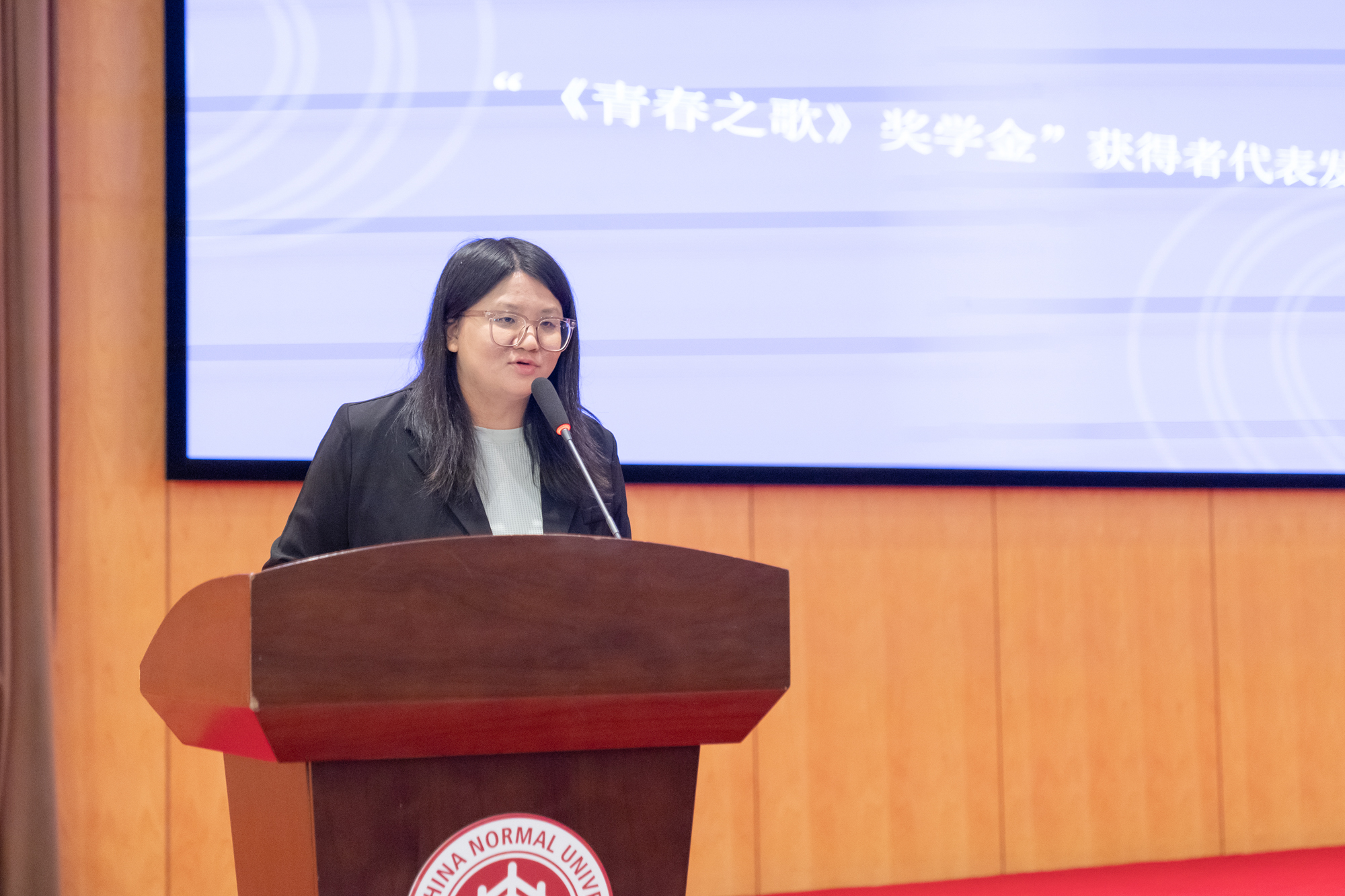 李敬泽、格非、李洱、王宏图四位嘉宾为“《青春之歌》奖学金”获得者代表颁发证书。永利皇宫登录官网创意写作专业三年级硕士生水笑莹作为获得者代表发言,在发言中感谢大奖的激励与创意写作专业的培养。