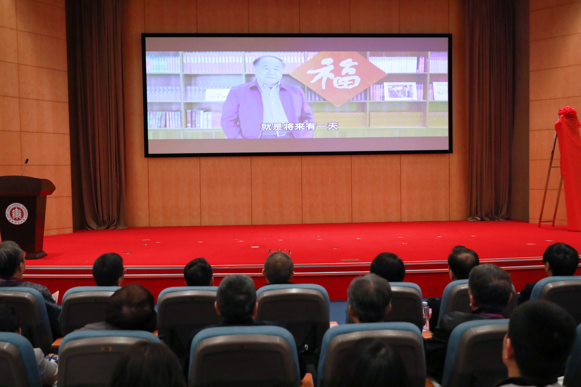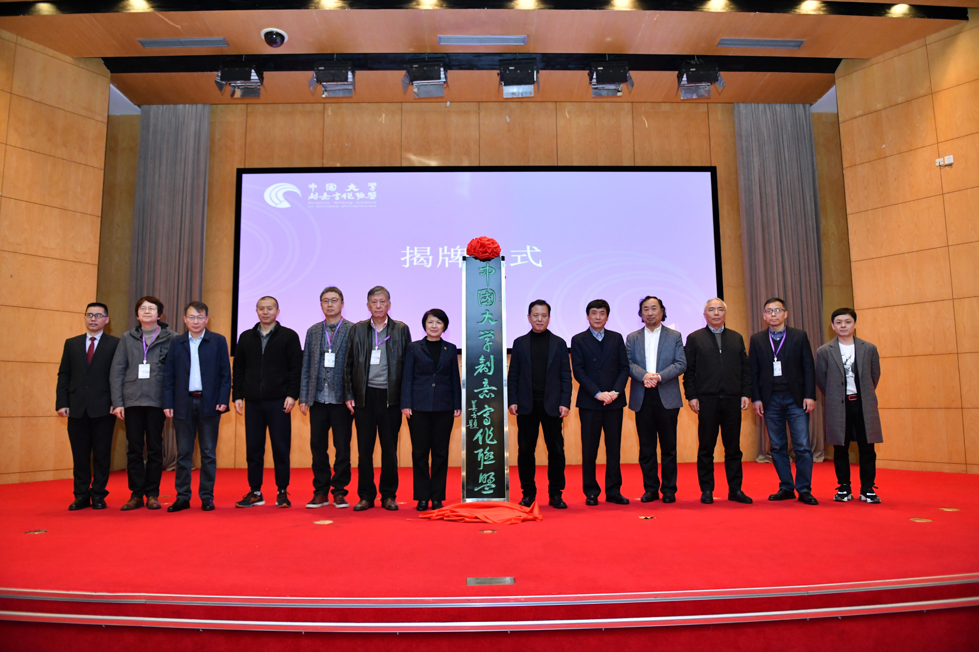 揭牌时刻。中国大学创意写作联盟匾额由莫言先生题写