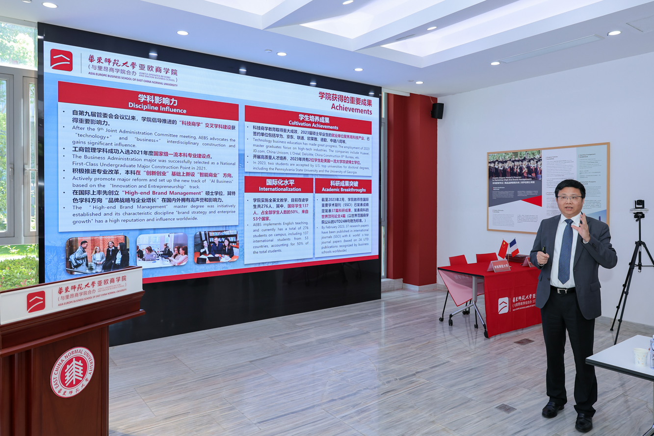 亚欧商学院中方院长何佳讯、法方院长王华汇报学院发展成果