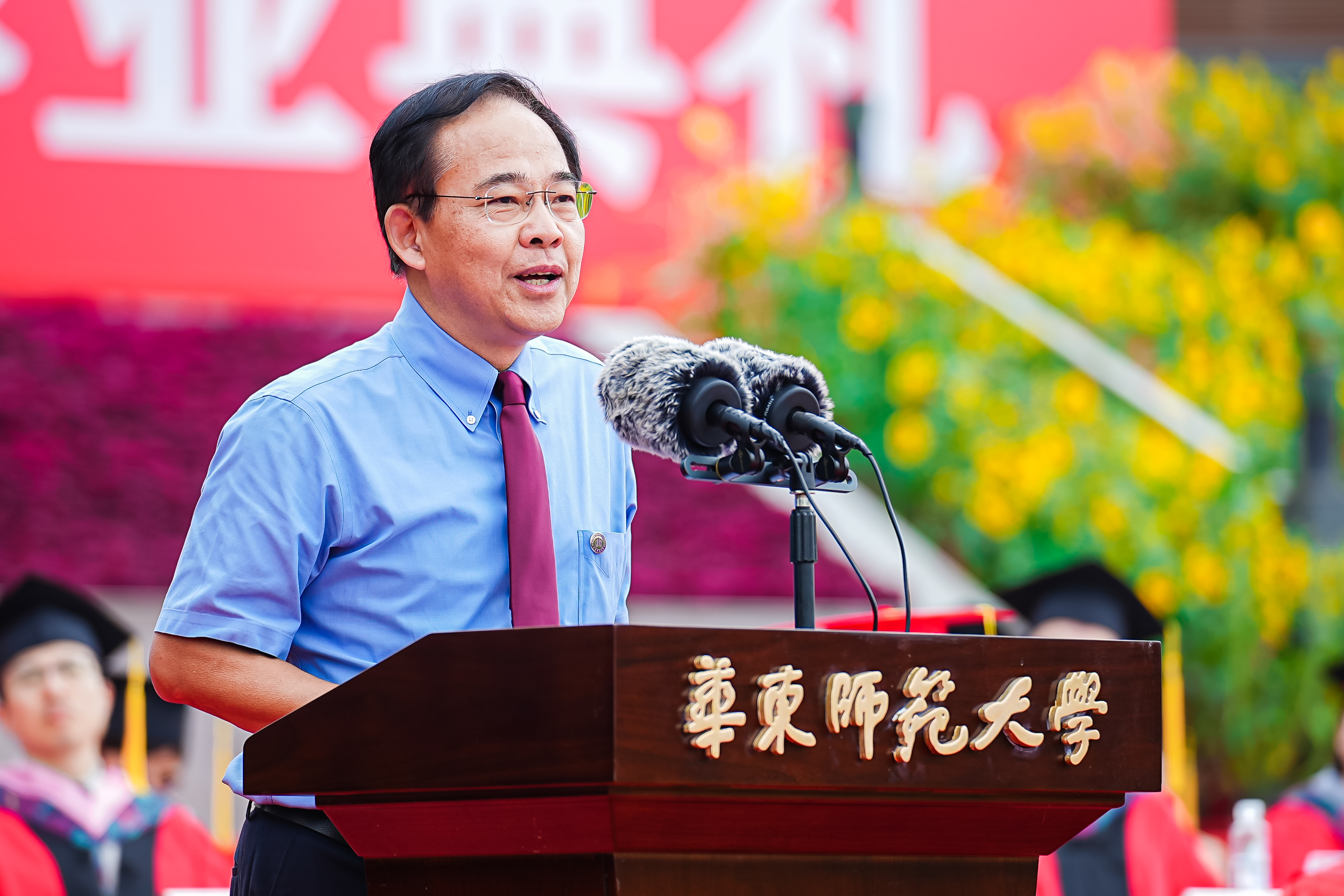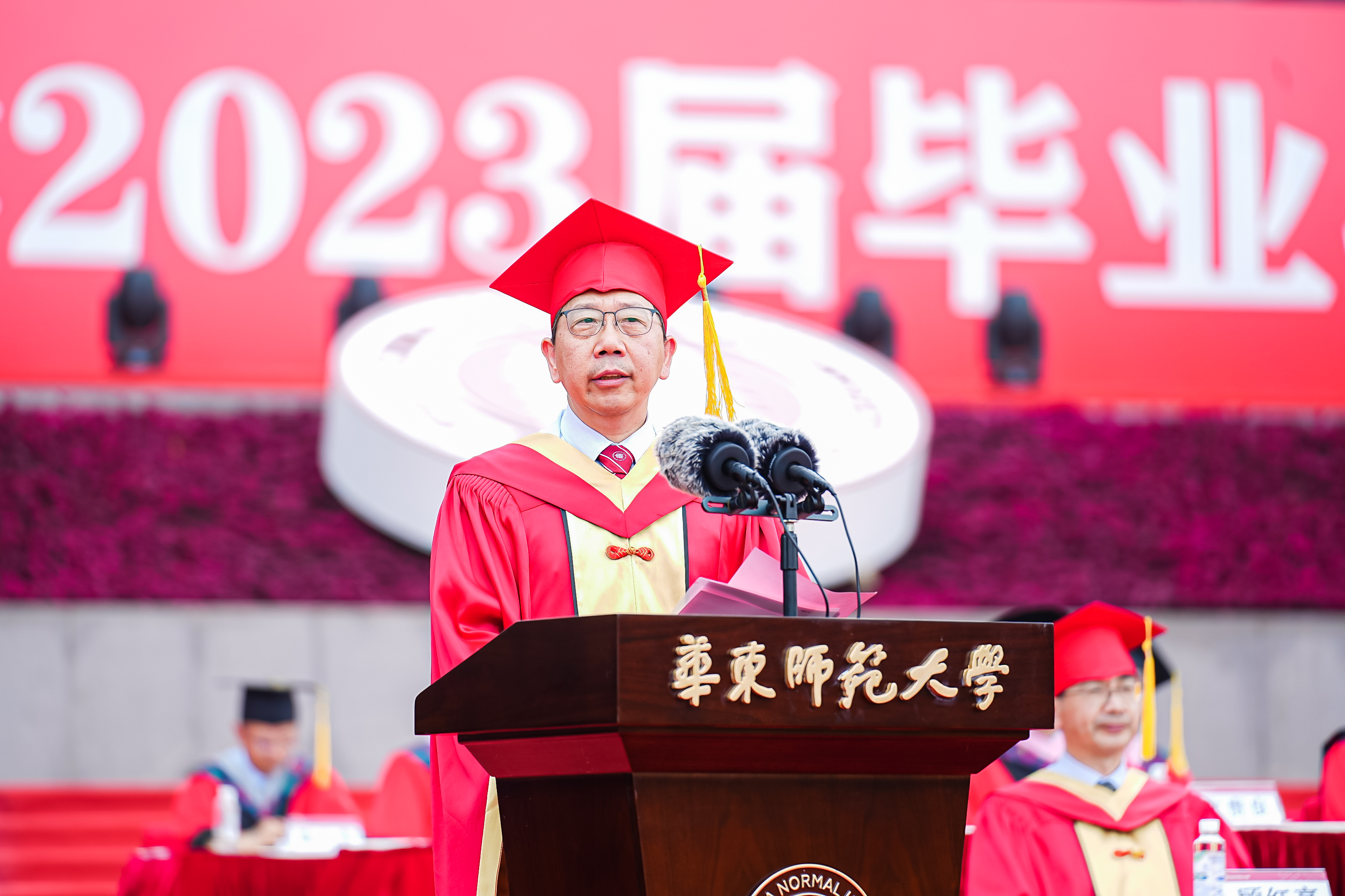作为教师代表,政治与国际关系学院院长吴冠军教授在致辞中对华东师大毕业生寄予厚望,希望他们“展翅腾飞,在未来岁月中实现潜能、绽放生命”。他指出,走出学校的校门,绝不是挥别学习的生涯。面对GPT时代的挑战,他建议同学们要做量子思维的使用者。他说,“在人工智能时代依然追求卓越的人、不放弃学习甚至终身学习的人,就是华东师大要培养的人。”