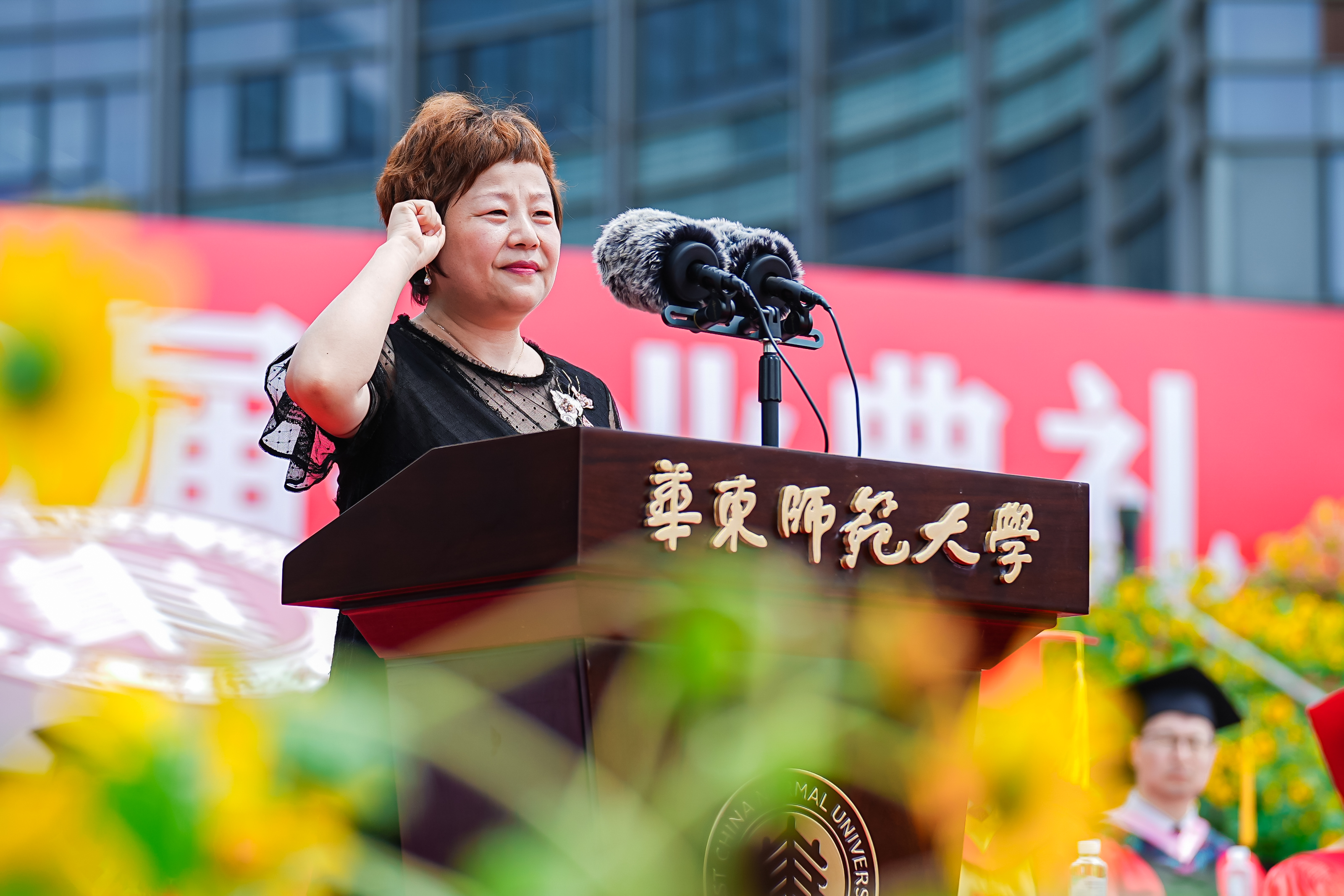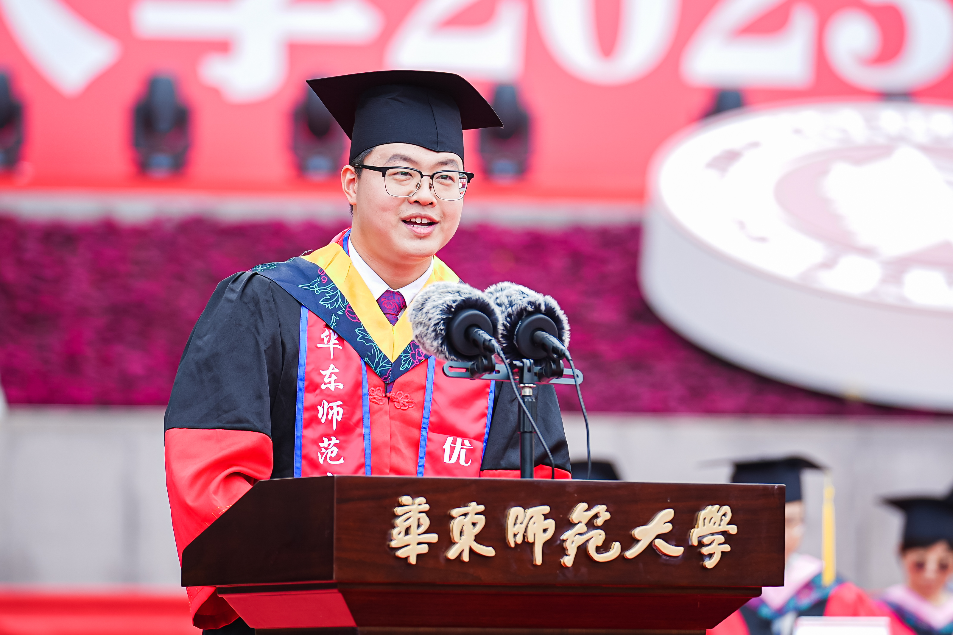 在毕业生风采展示暨全体毕业生出征仪式上,科技创业的院旺、保研北京大学继续深造的求倩一、将赴西部支教的刘甜忻、即将成为上海市向明中学高中化学教师的蔡君怡、将赴郑州轻工业大学担任体育教师的邢洺祎、签约上海市专项选调生的臧谦禧等六位毕业生,以铿锵有力的朗诵展示了华东师大毕业生踔厉奋发、砥砺前行的风采。