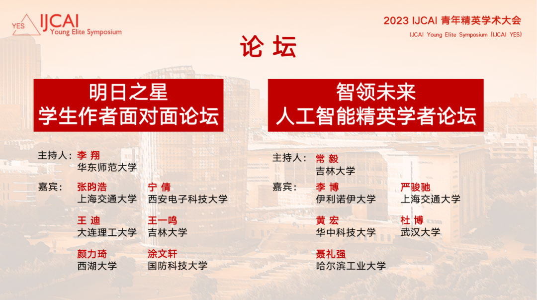 查看最新议程和嘉宾名单,请登录 2023 IJCAI YES 官网:https://ijcai.org.cn/