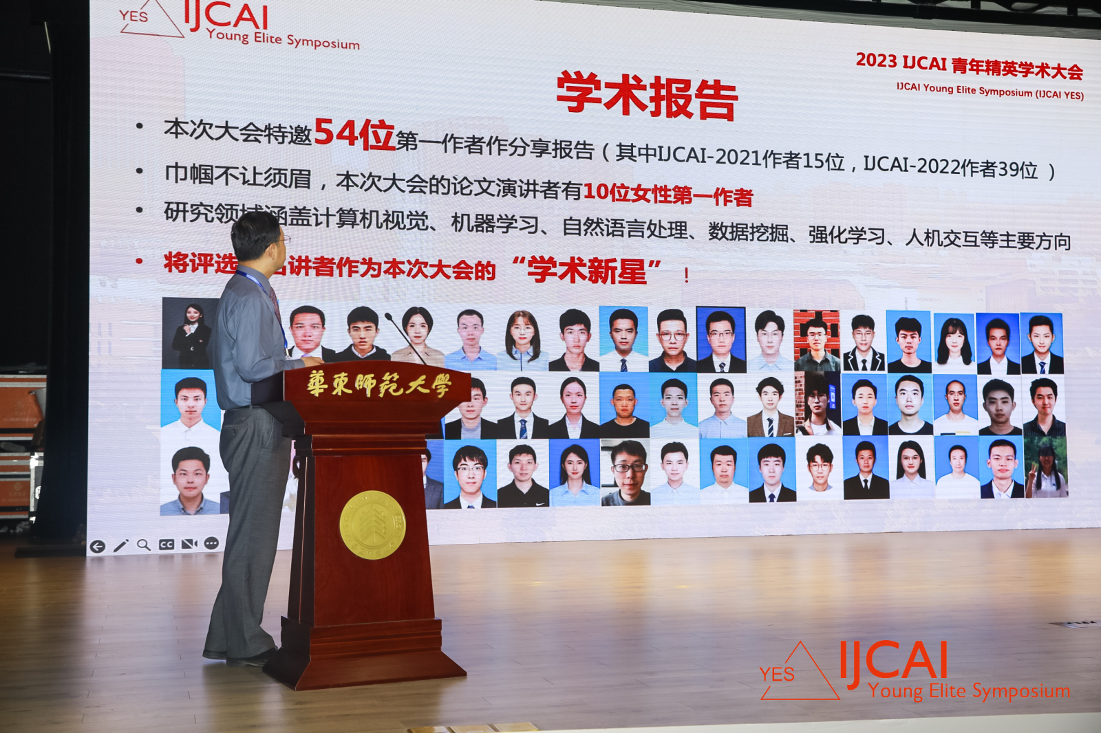 今天,华东师大丽娃河畔开启为期三天的智慧盛宴。2023 IJCAI YES(Young Elite Symposium)青年精英学术大会开幕!5大主旨演讲,54个学术报告,2场论坛,1个对谈,多图直击开幕盛况!