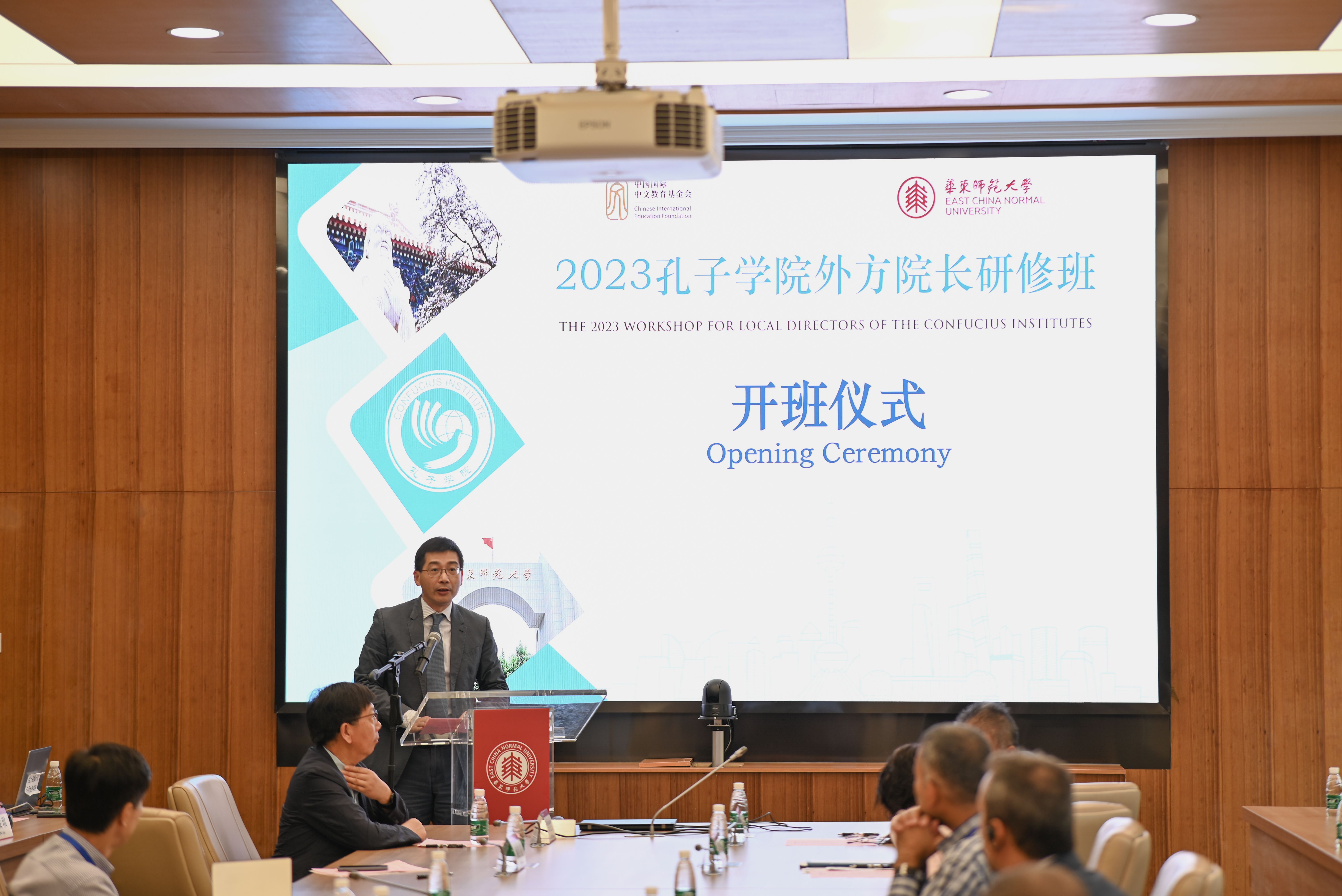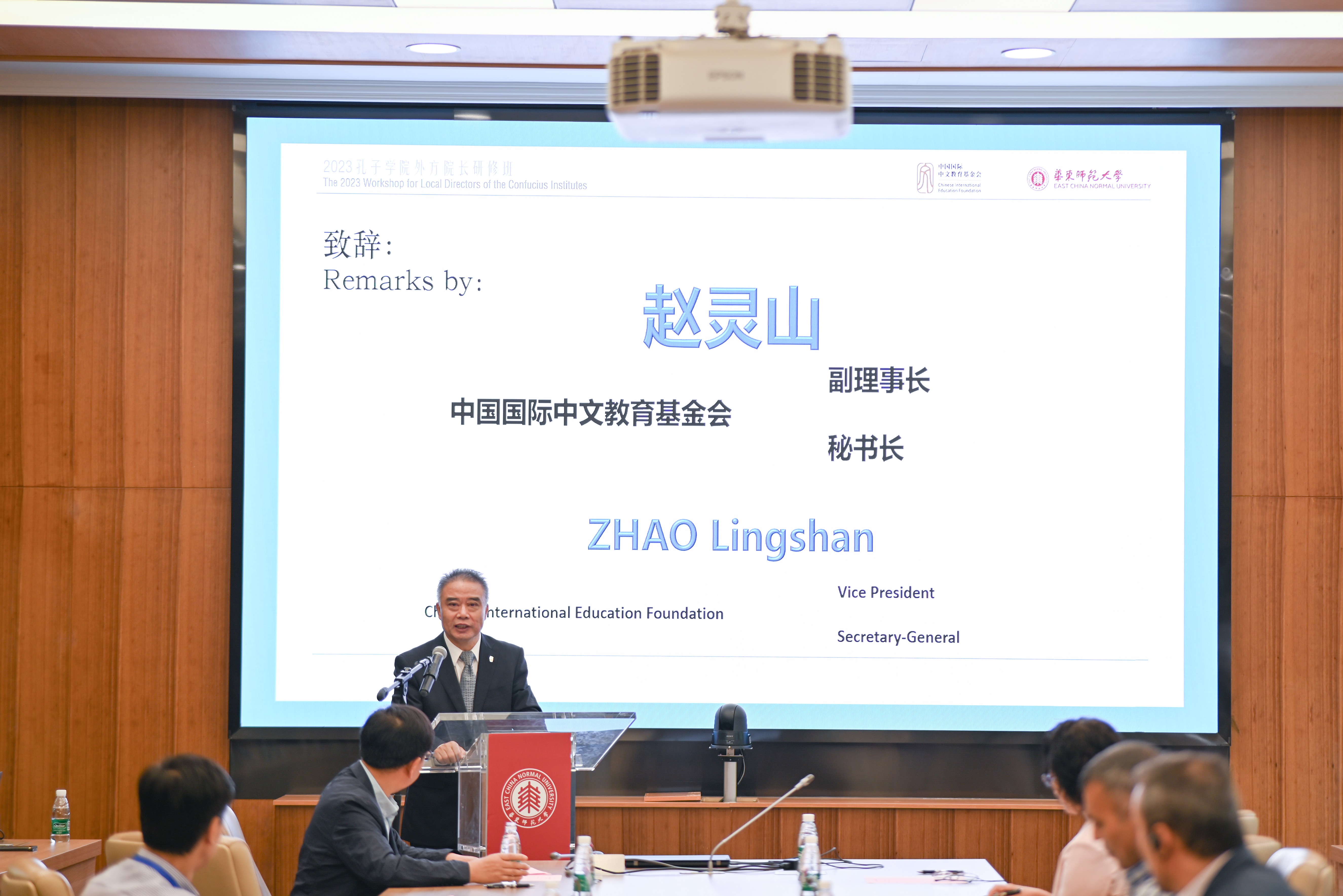 中国国际中文教育基金会副理事长、秘书长赵灵山向始终支持孔子学院事业的全体外方院长表达了由衷的敬意和美好的祝愿,并向华东师大精心筹备此次研修活动表达了感谢。他介绍了基金会成立三年来孔子学院的发展和变化,并期待外方院长发挥出更大作用。赵灵山表示,“智者搭桥,愚者筑墙”,孔子学院始终是那座促进中外教育文化交流、增进文明理解的金桥。