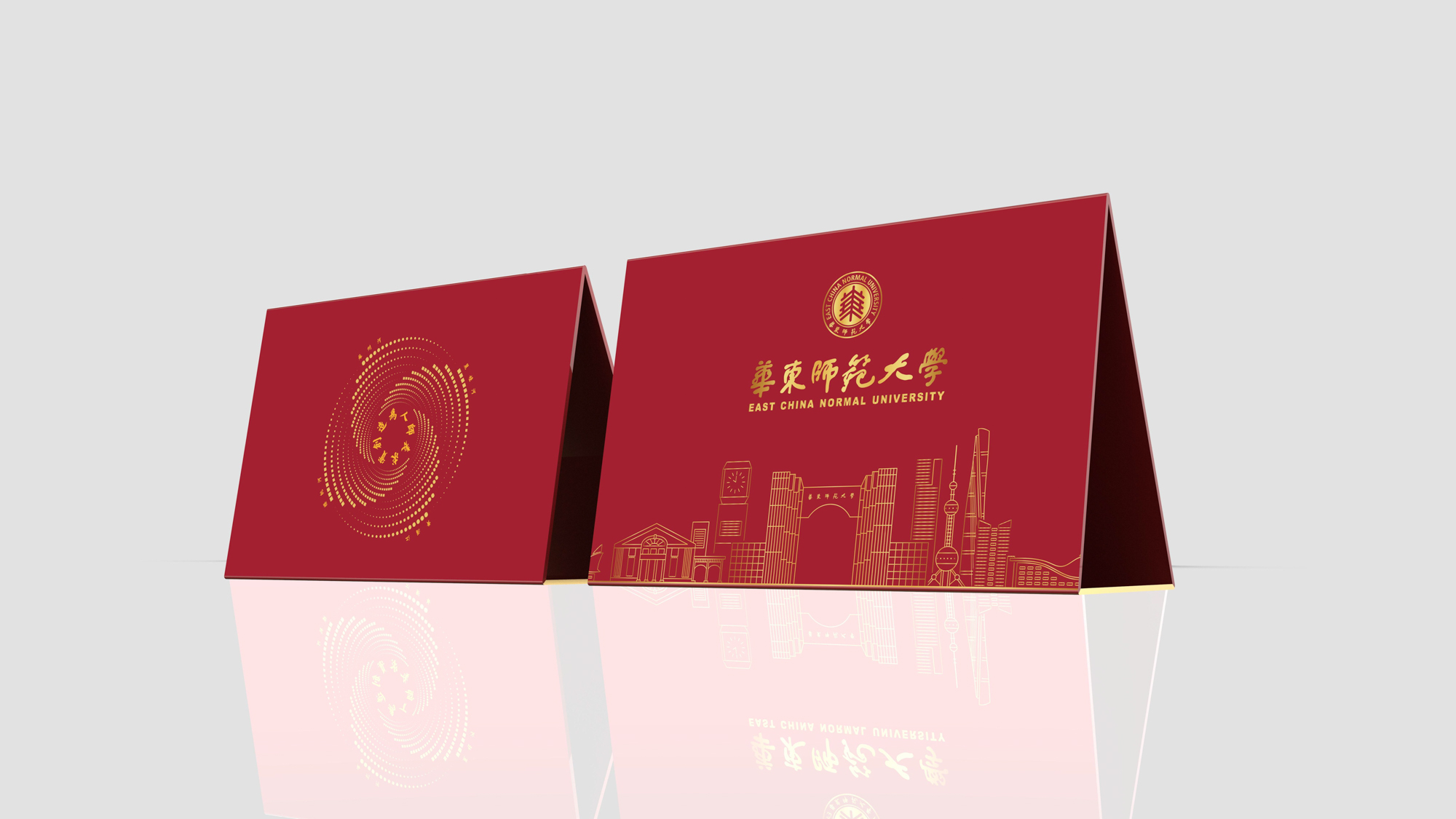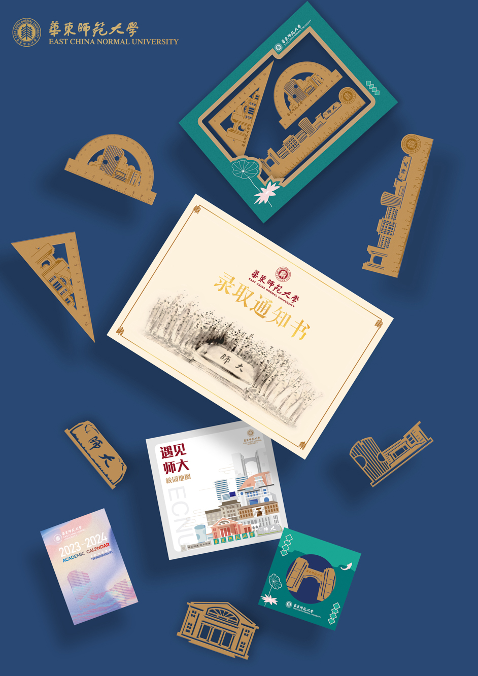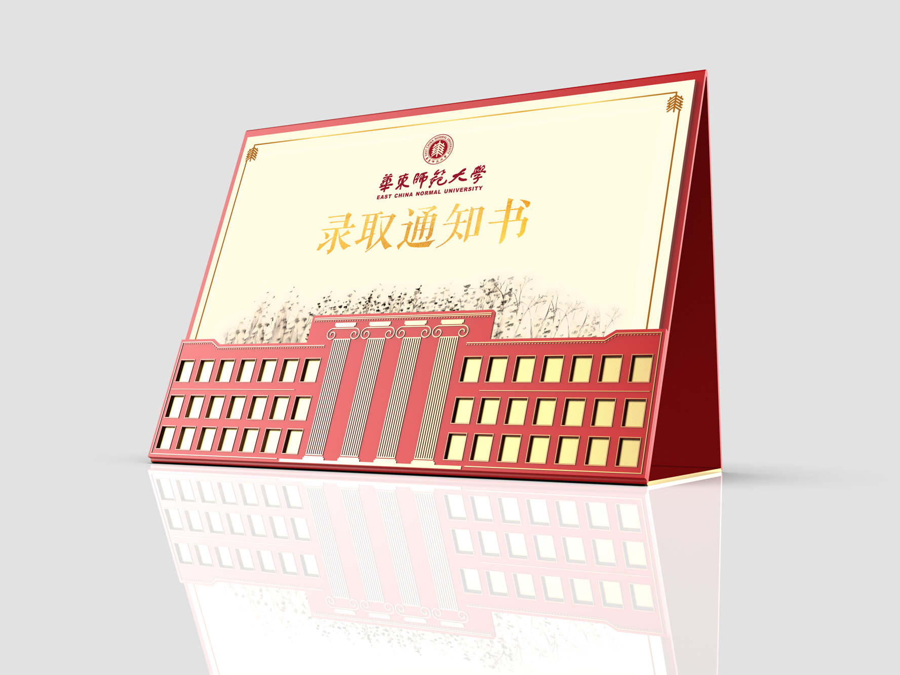 封套展开后,三角形展示台正面展示了录取通知书和华东师大校园建筑群贤堂的视觉元素。