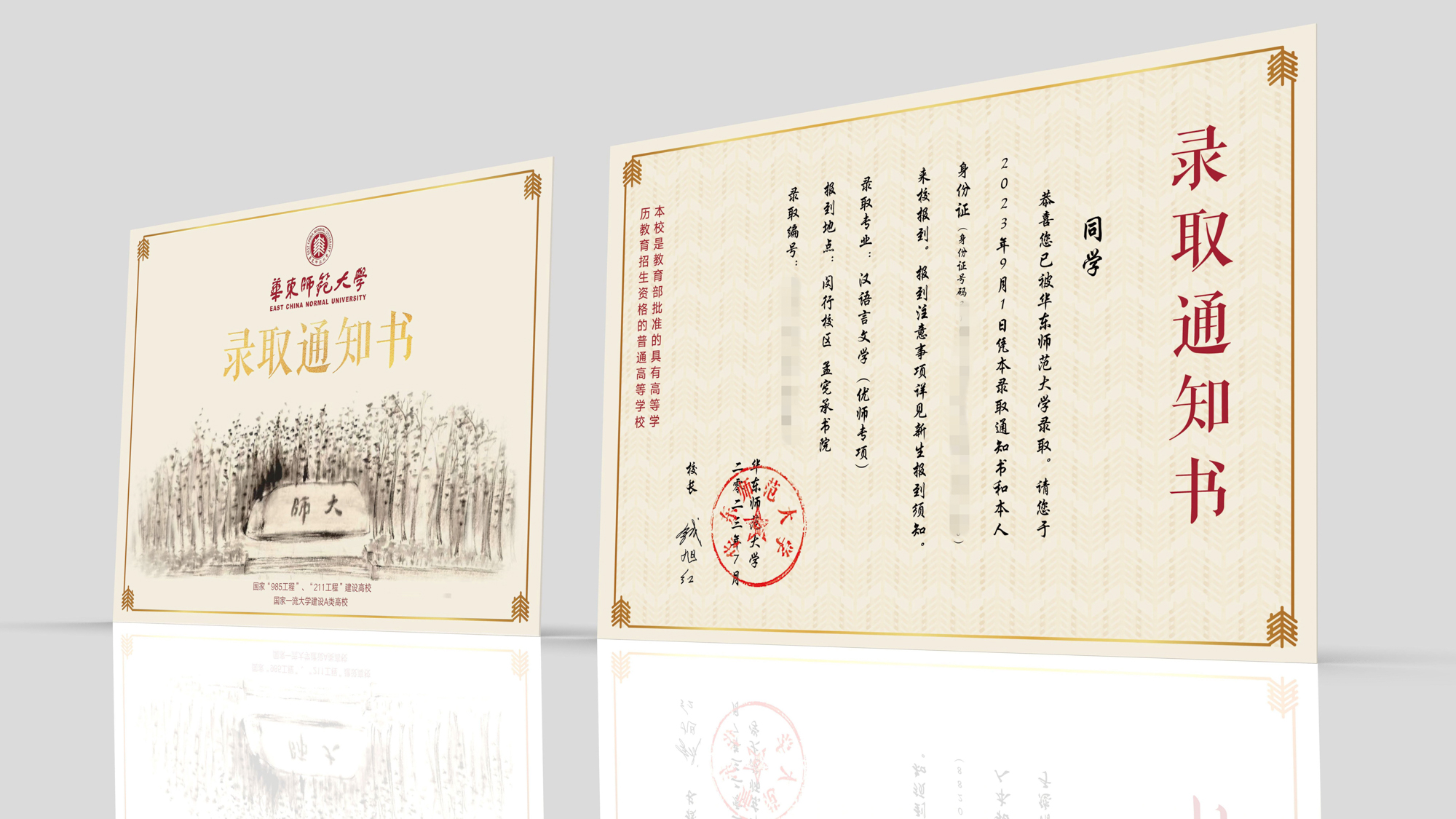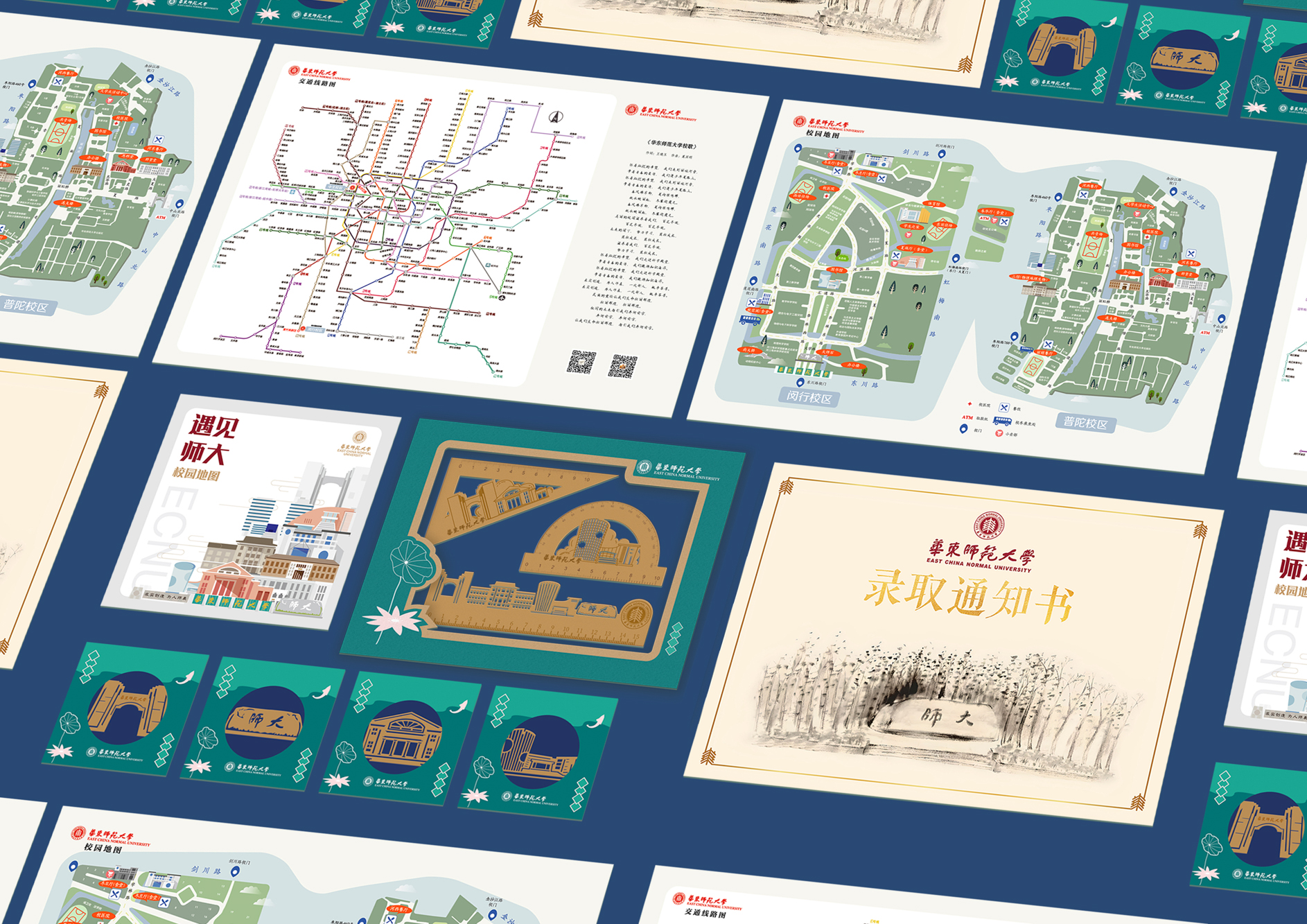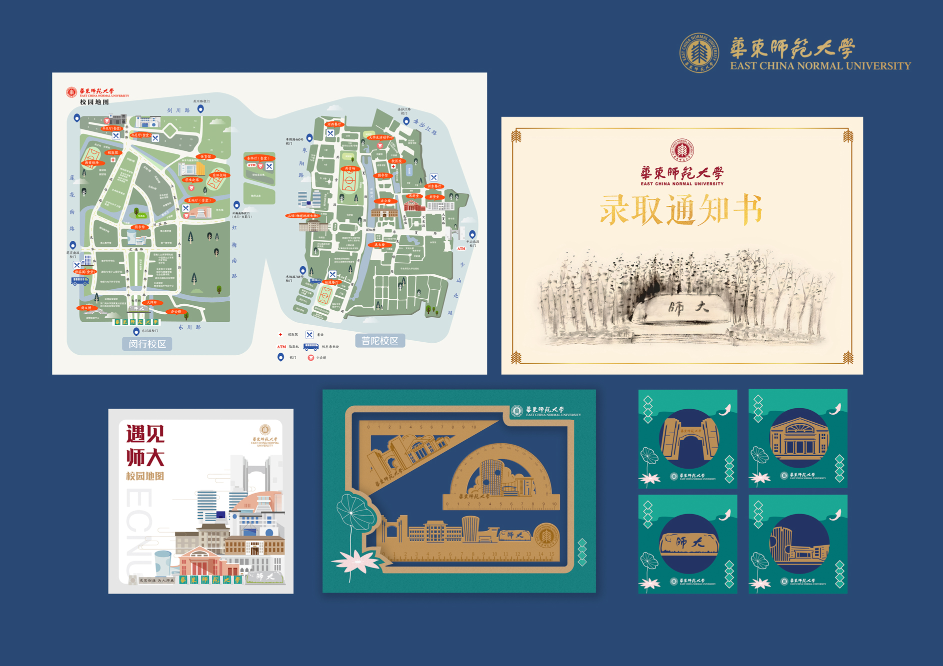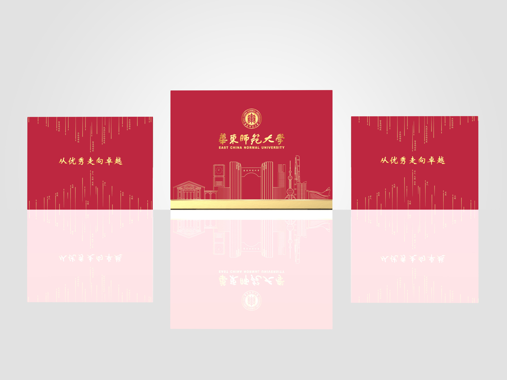 封套展开后,三角形展示台正面展示了录取通知书和华东师大校园建筑群贤堂的视觉元素。