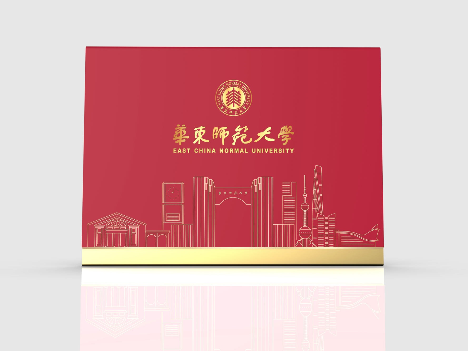 封套正面绘制了华东师大的LOGO和标志性建筑剪影,在建筑剪影中巧妙地融入了上海地标建筑元素,强调华东师大在上海的地域特色和深厚的历史底蕴,凸显华东师大的优雅学府风范。
