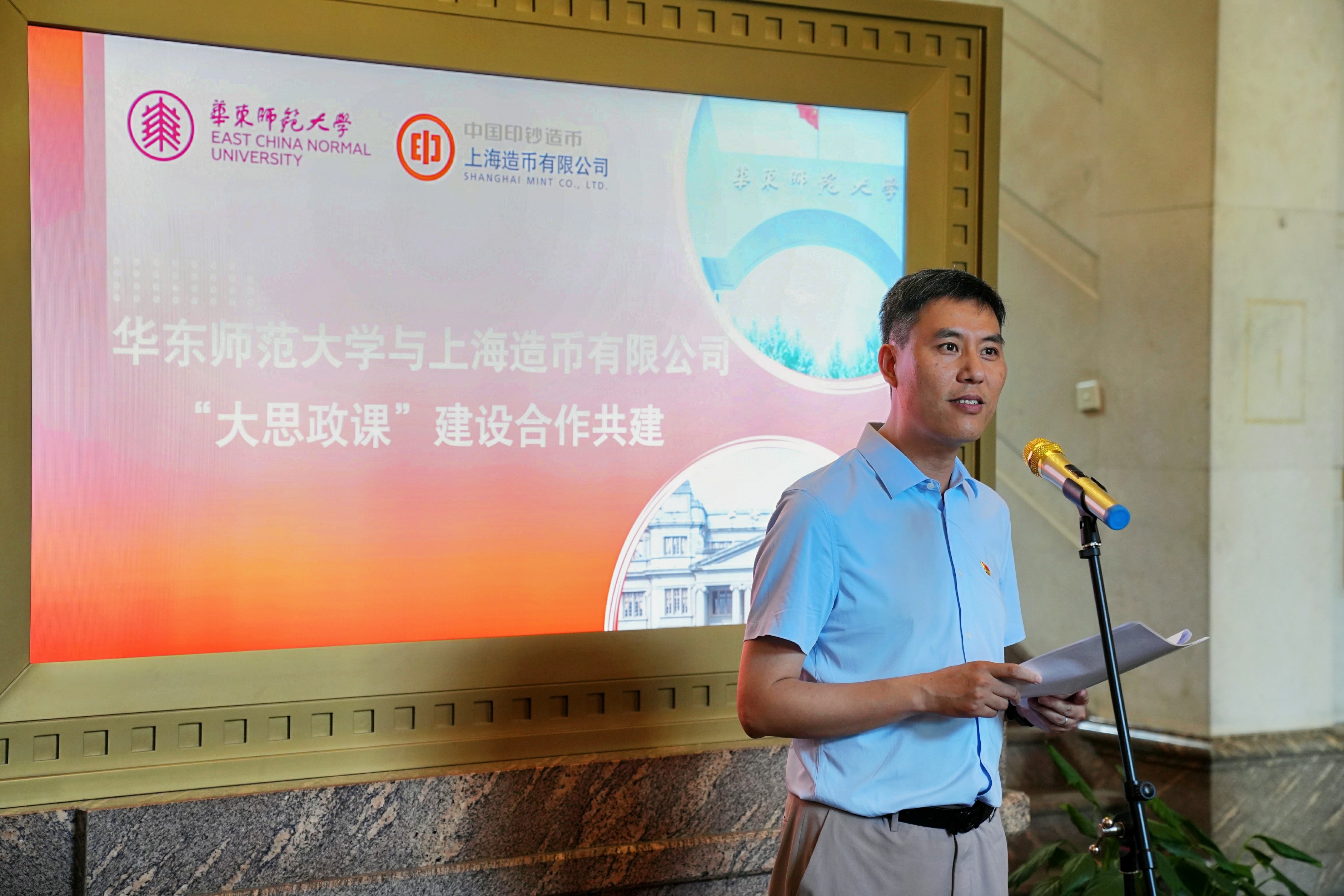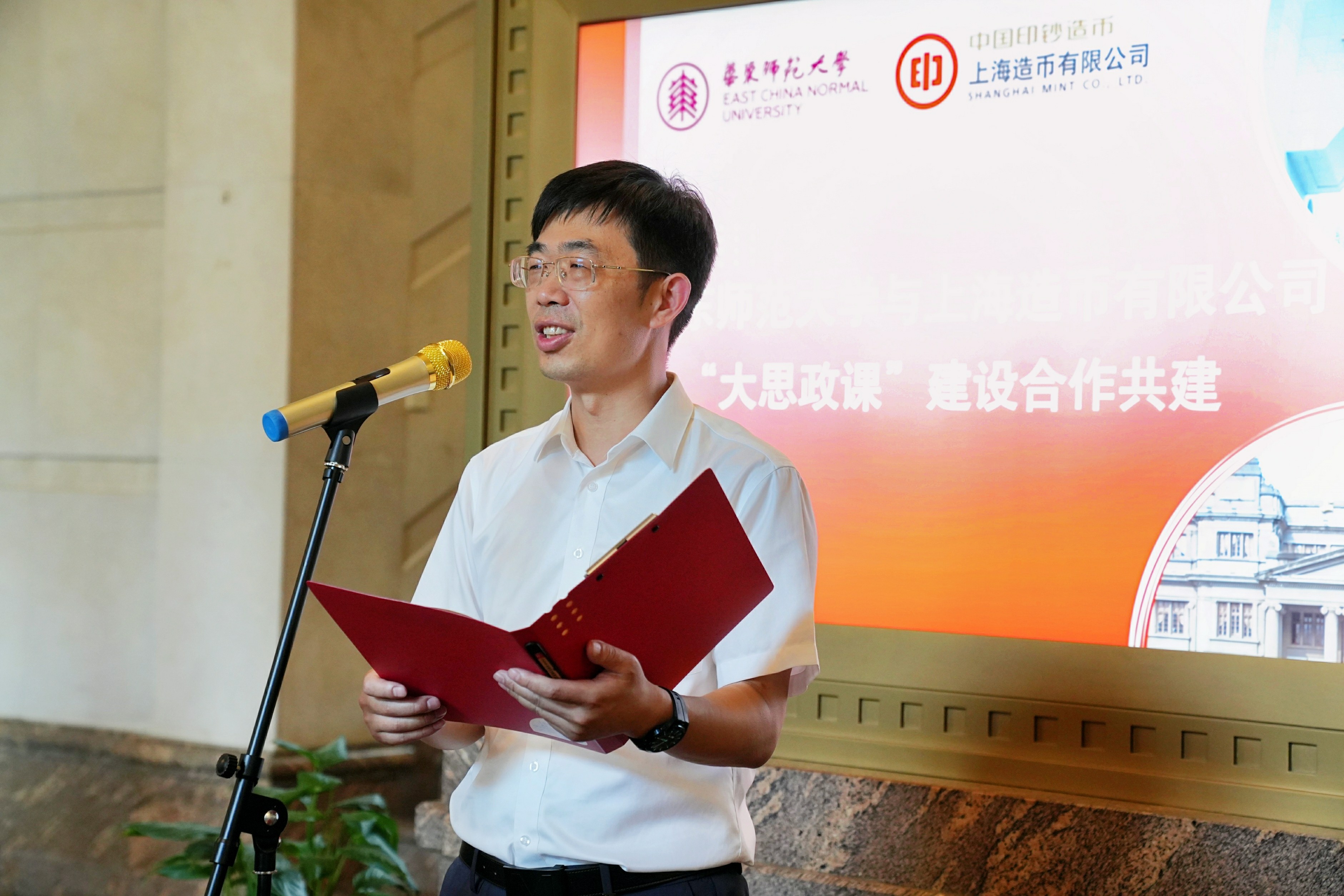 上币公司党委书记刘科在致辞中首先感谢华东师大对本次合作共建的信任和支持,并表示,上海造币有限公司是苏州河工业文明的一颗璀璨明珠,并于2022年7月入选教育部与工信部等八部委公布的首批‘大思政课’实践教学基地。通过本次合作共建,他希望双方能够充分发挥各自优势,深入挖掘货币文化蕴含的时代价值和思想内涵,进一步丰富“大思政课”的教育资源,更好开展多样化的实践教育活动,打造“大思政课”校企合作的“新亮点”。