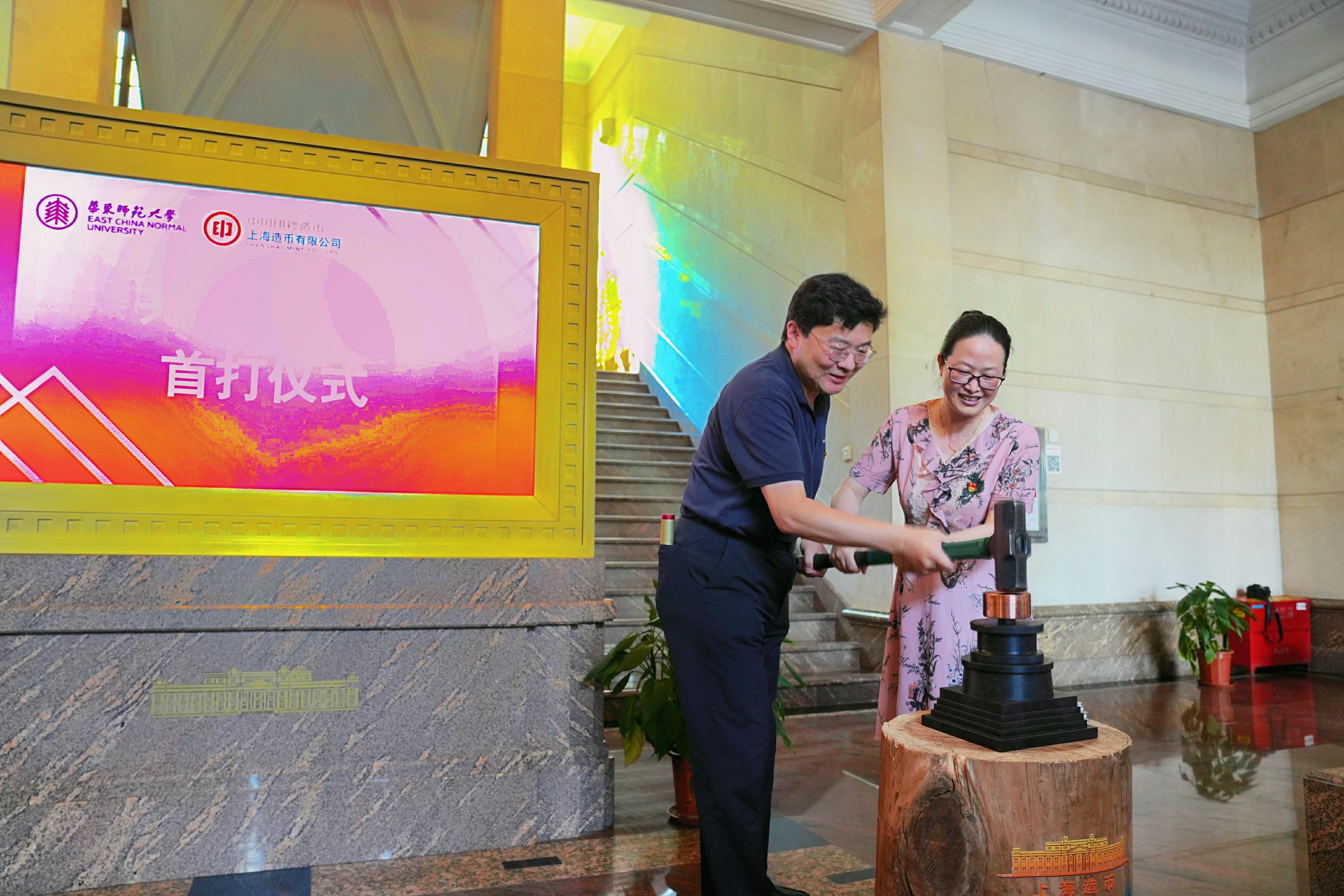 上币公司总经理袁展宏与设计学院党委书记俞世恩共同手打纪念章