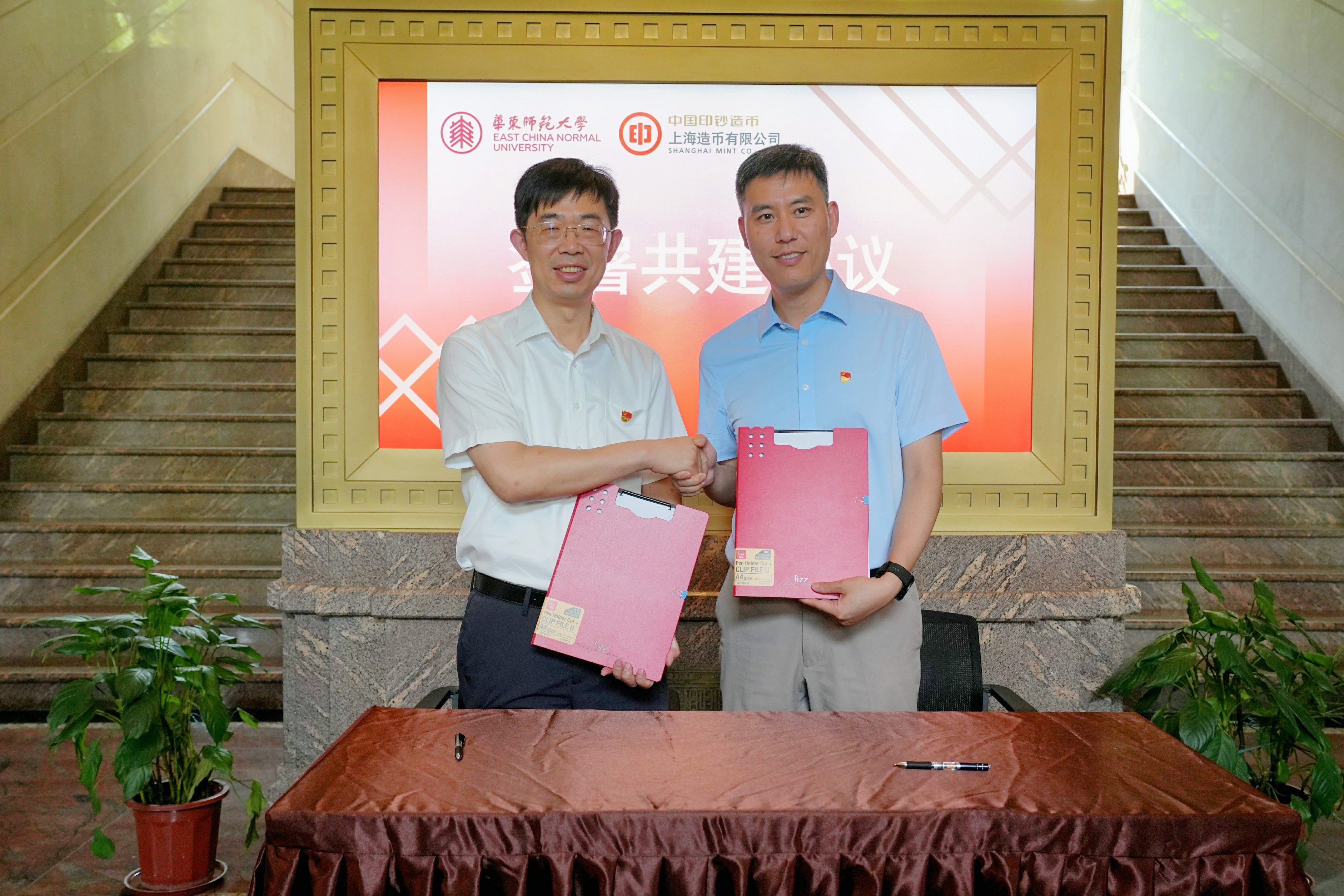活动现场,上币公司党委书记刘科、校党委副书记孟钟捷共同签署了“大思政课”建设合作共建协议。上币公司副总经理袁展宏、设计学院党委书记俞世恩一同手打共建纪念章。纪念章正反面分别印有永利皇宫登录官网校徽、上海造币有限公司标识LOGO,双方合作共建正式启动。
