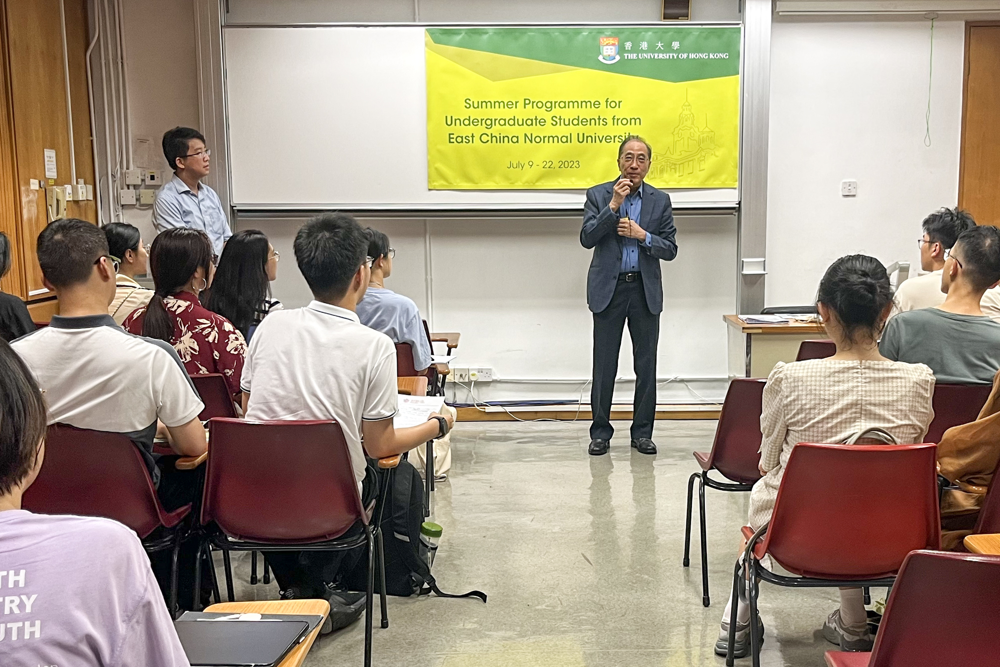 7月10日,在开班仪式上,文学院Michael LUK教授代表香港大学表达了对师大学子的欢迎,介绍了港大的历史和代表人物,希望同学们在两周的时间中学有所成、学有所获。华东师大地理科学专业本科生江东翼代表师大学子表达了对项目的期待,感谢两校为交流合作付出的努力。