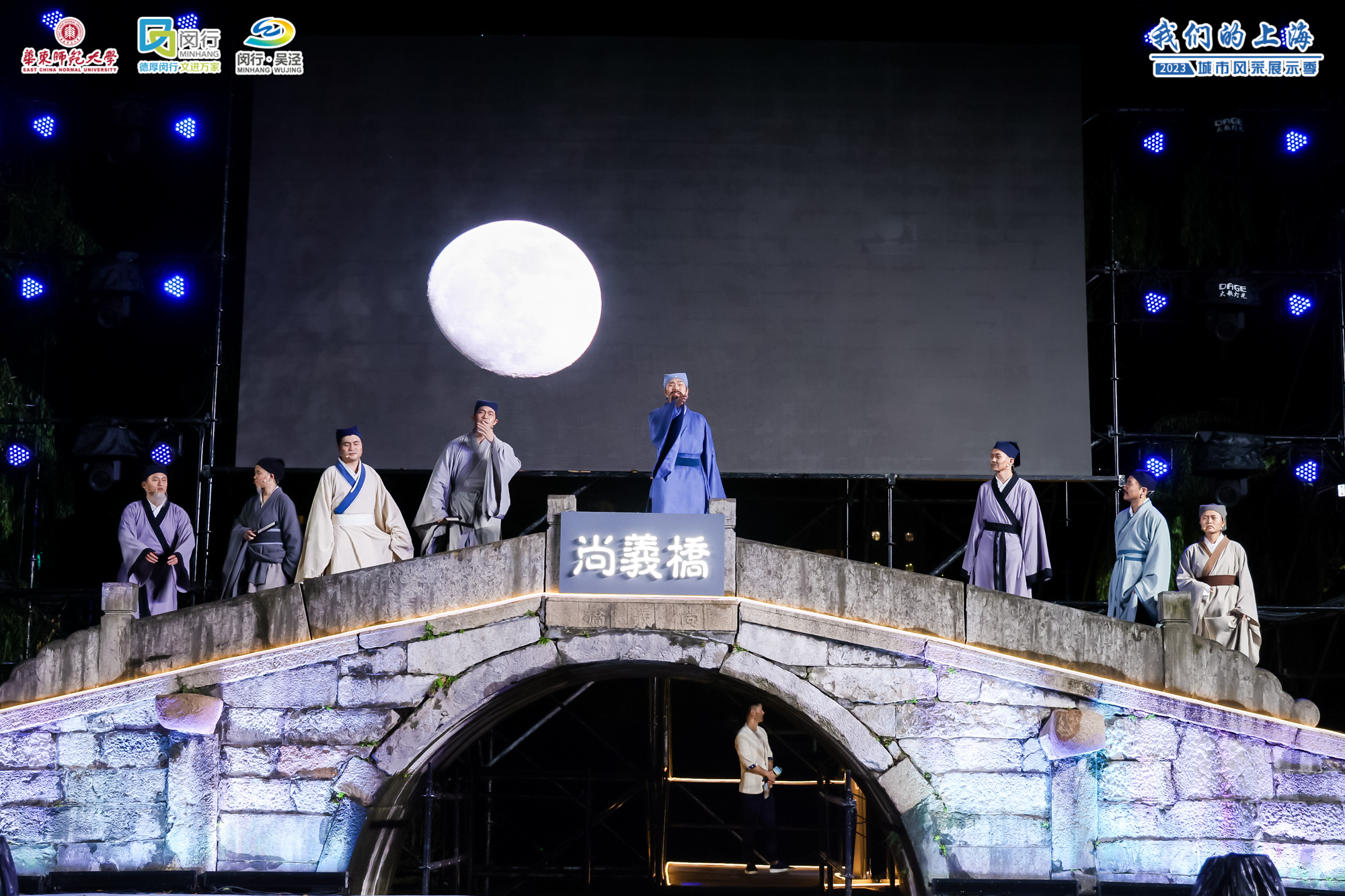 华东师大闵行校区樱桃河上的尚义桥始建于明代,为进士蒋性中为方便乡人出行而捐资修建。蒋公造桥的义举百余年来被后人所传颂与宣扬,也成为了闵行,乃至上海的一段历史佳话。在当天的文艺晚会上,来自华东师大孟宪承书院的师生们在尚义桥前,通过情景演绎的方式,重现了500多年前蒋性中等“莺湖九老”雅集聚会、吟诗诵词的盛景。