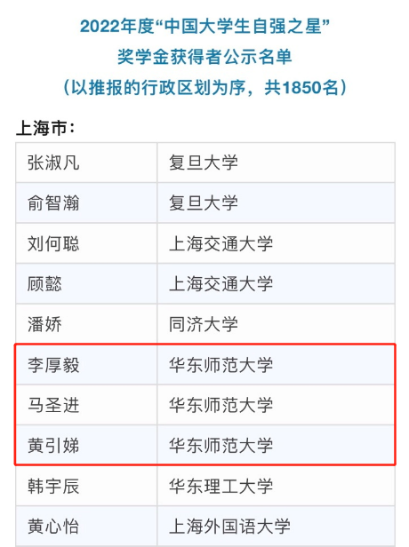 2022年度“中国大学生自强之星”奖学金推报活动结果揭晓,华东师大三位同学上榜!祝贺教育学部2020级本科生李厚毅、计算机科学与技术学院2021级硕士研究生马圣进、化学与分子工程学院孟宪承书院2020级本科生黄引娣!