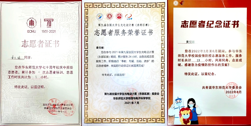 假期返乡,她也积极参与社区公益性岗位的服务,为家乡村民办实事。此外,她还参与华东师大70周年校庆、第九届全国大学生光电设计竞赛志愿者等志愿服务,累计时长200多小时。