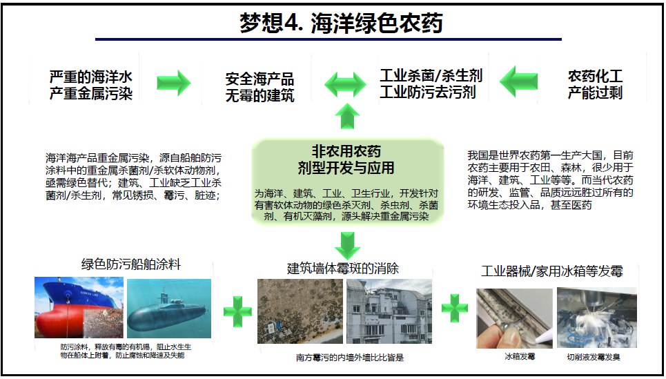 我国是世界第一农药生产与应用大国,产能过剩,所以我们可以将其转换到非农用途,进行农药剂型的创新开发与应用,为海洋、建筑、工业、卫生行业的绿色发展,创造新的可能性。