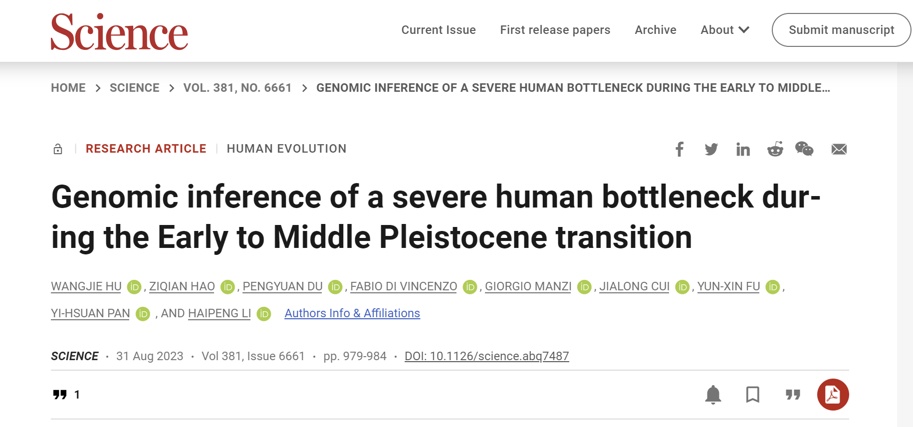 北京时间2023年9月1日,国际学术期刊 Science 在线发表了中国科学院上海营养与健康研究所李海鹏研究组与永利皇宫登录官网脑功能基因组学研究所潘逸萱研究组合作的题为“Genomic inference of a severe human bottleneck during the Early to Middle Pleistocene transition”的最新研究成果。该研究创建了快速极小时间溯祖(FitCoal)新理论,并发现人类在早、中更新世过渡期由于气候环境的急剧变化经历了严重的群体瓶颈,人类祖先近乎灭绝。
