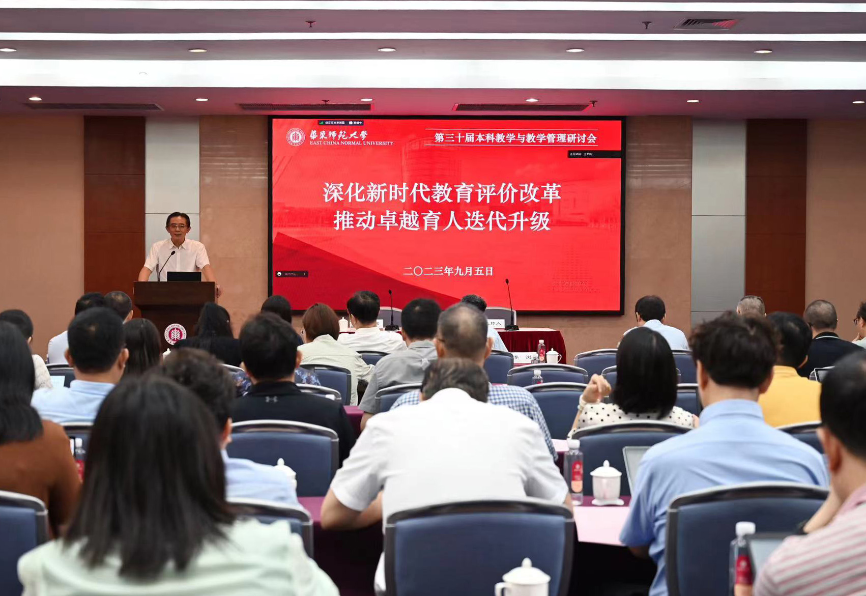 9月5日,华东师大第三十届本科教学与教学管理研讨会在闵行校区召开,会议以“深化新时代教育评价改革,推动卓越育人迭代升级”为主题,并同步线上直播。校党委副书记孟钟捷,副校长戴立益,第十三届校教学委员会委员,校本科教学督导组组长、副组长,相关职能部门负责人,书院院长,各学部、院系、公共教学部教学负责人,本科专业点(教学点)责任教授,各省招生组组长等近百人出席线下会议,60余人出席线上会议。教学委员会主任季浏、本科教学督导组组长陆嘉星、教务处处长周先荣先后主持会议。