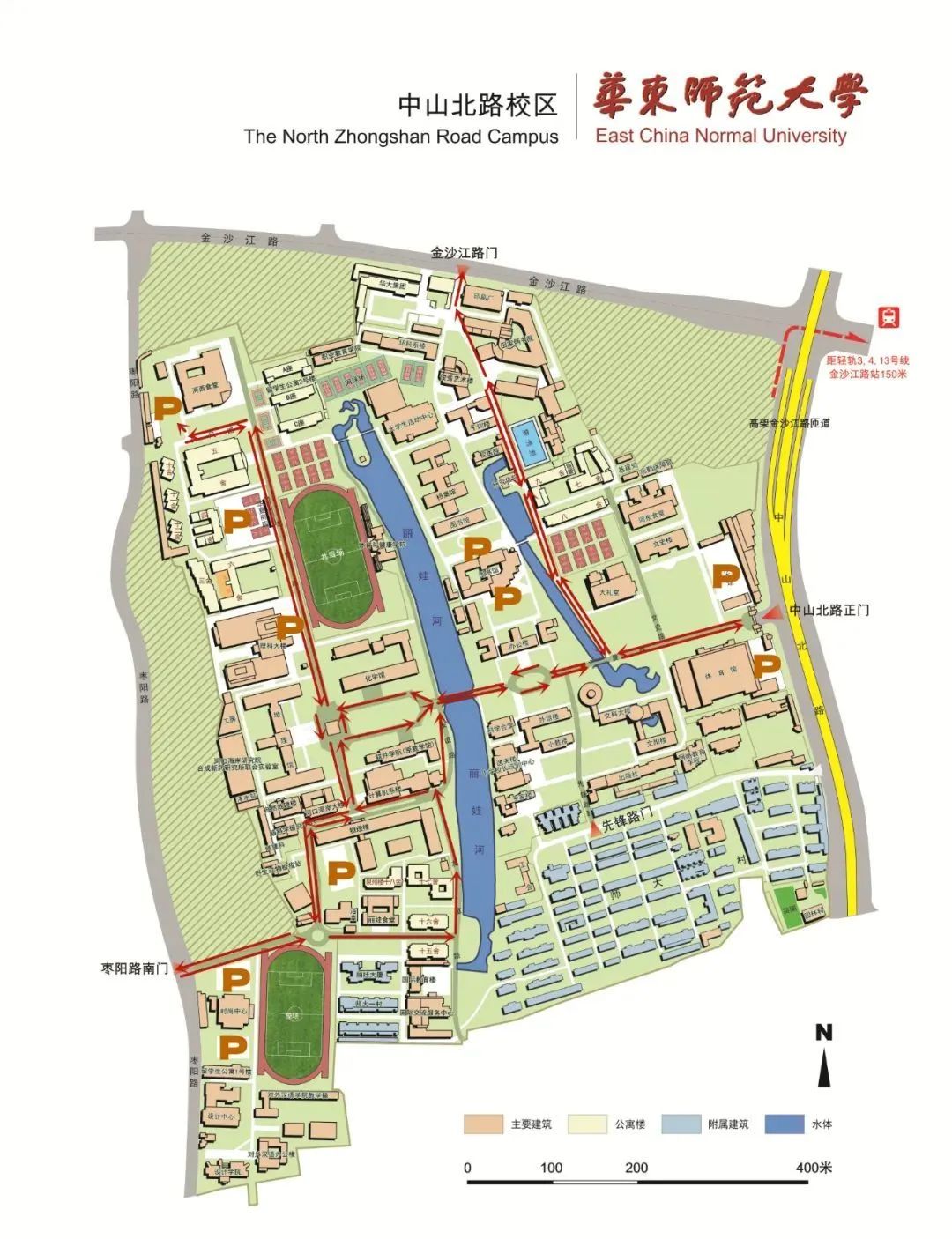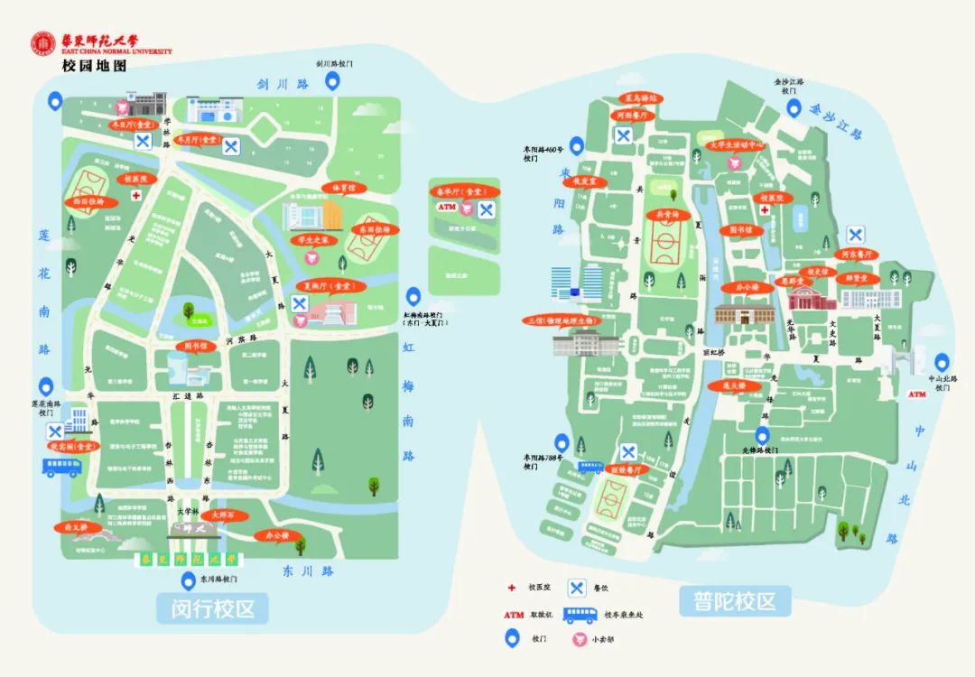 3、为确保校园主干道畅通,河西区域的机动车辆离校时建议从枣阳路788号门通行,河东区域的机动车辆建议从中山北路3663号门、金沙江路145号门离校。