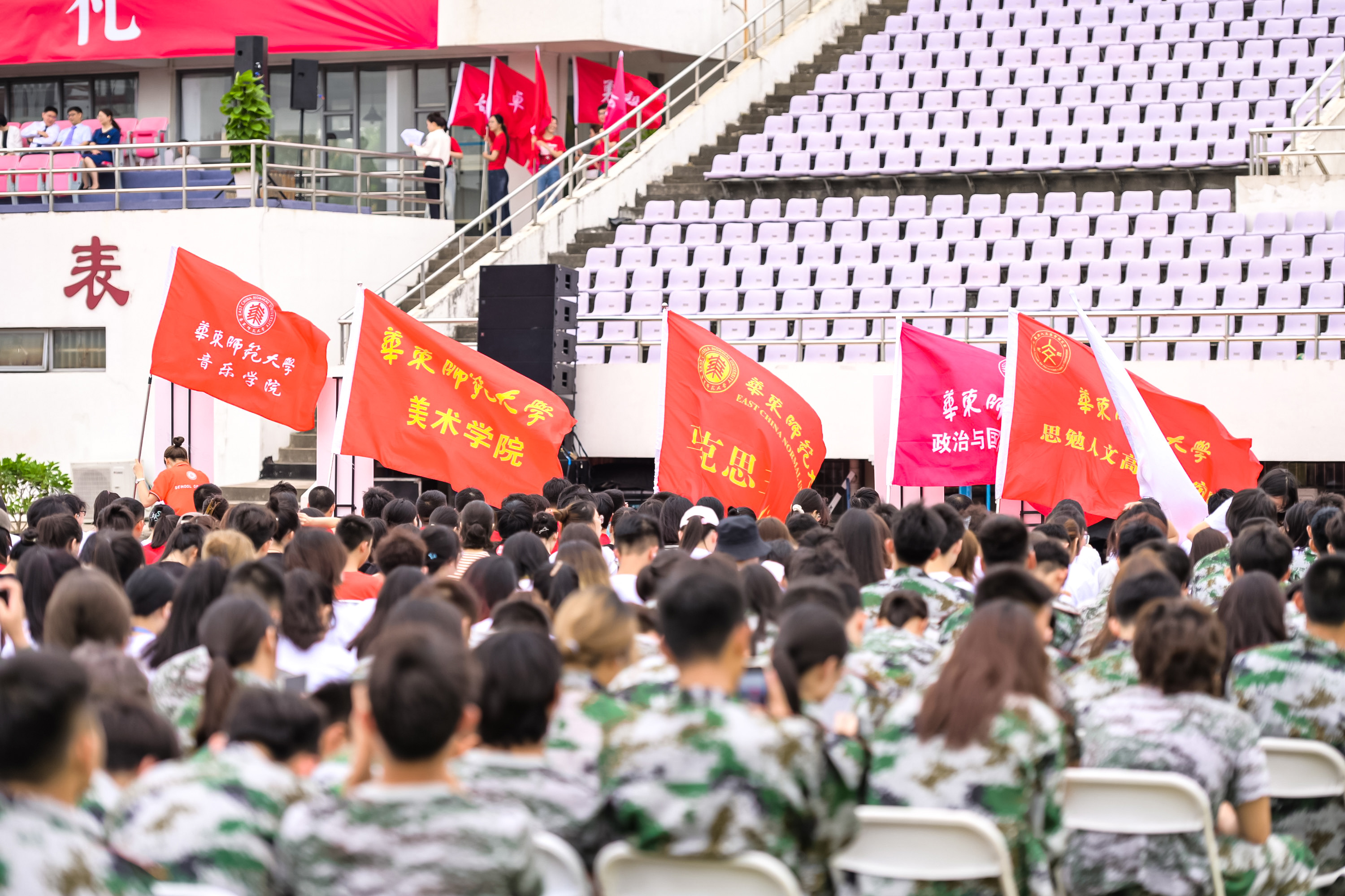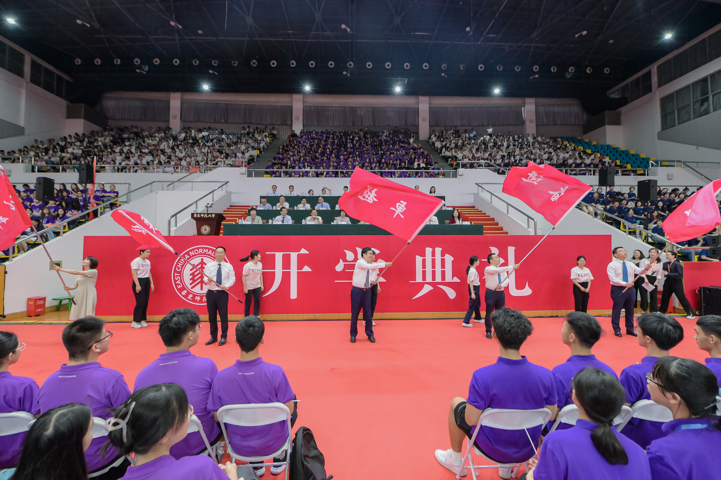带着师长们的期望和祝福,2023级新生代表从教育前辈的手中接过代表“卓越、创新、勇毅、奋进、担当”精神的五面旗帜,立志在华东师大成为更好的自己。